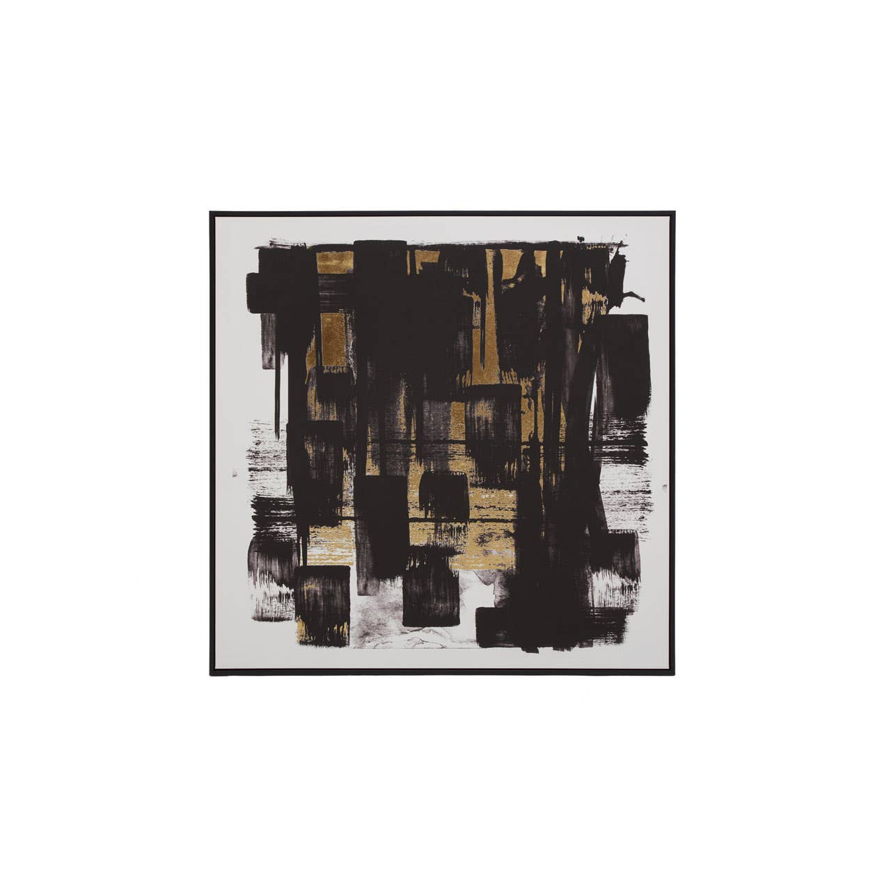 The Astratto wall art exhibits an abstract style by using black and white paint strokes, paired with gold foil, which articulates a warm metallic effect. The canvas is surrounded by a clean and smooth wood frame.