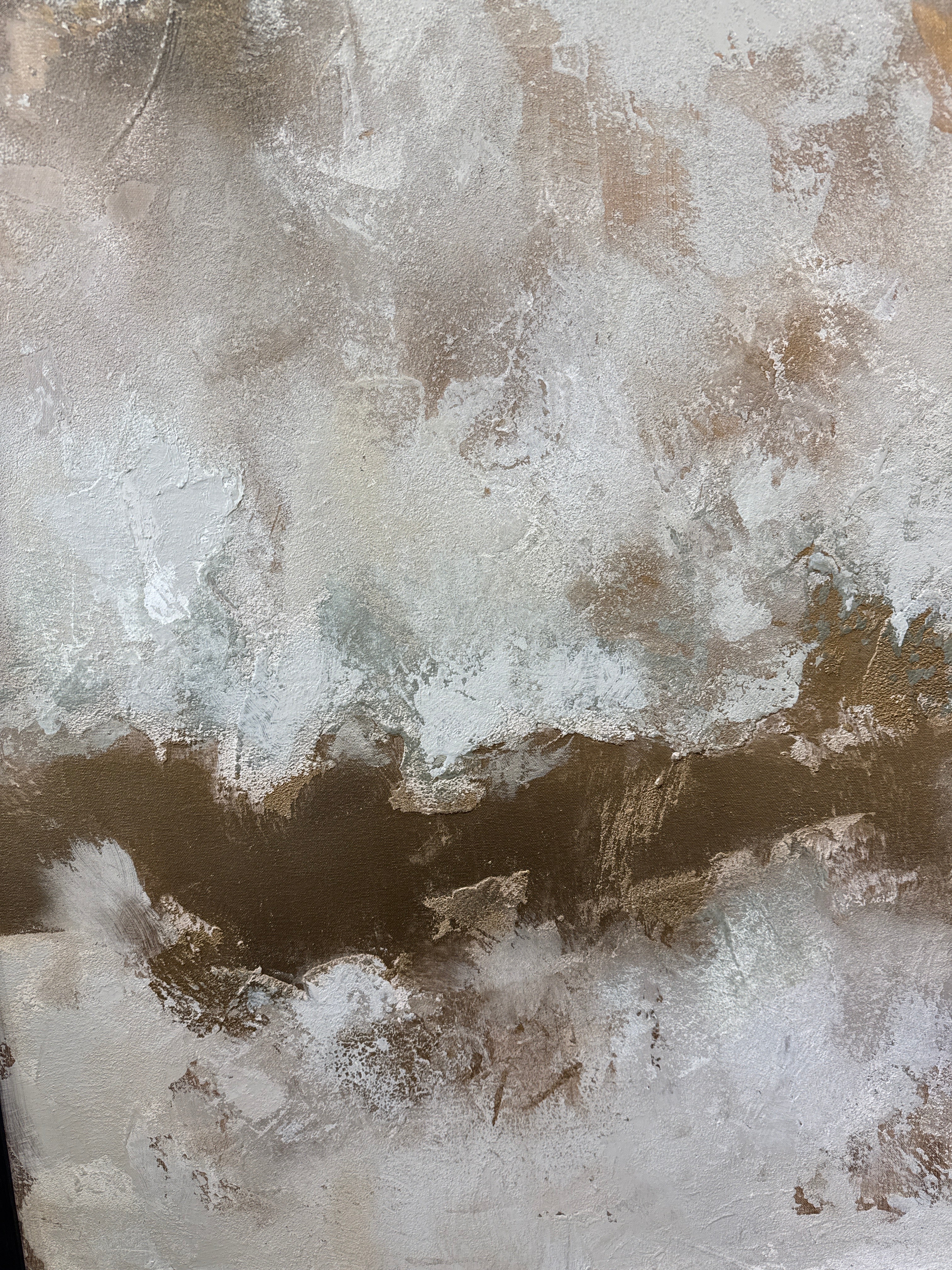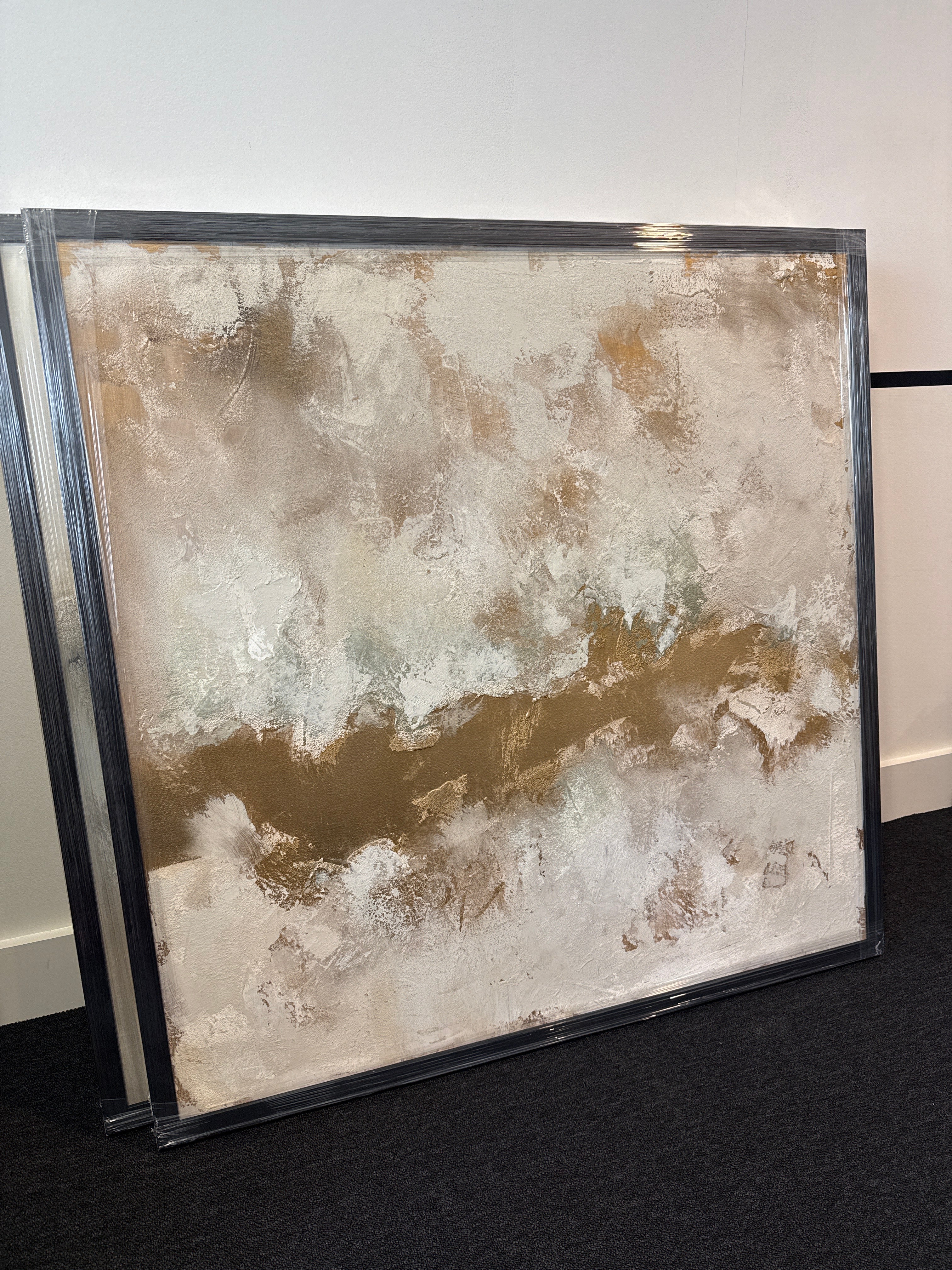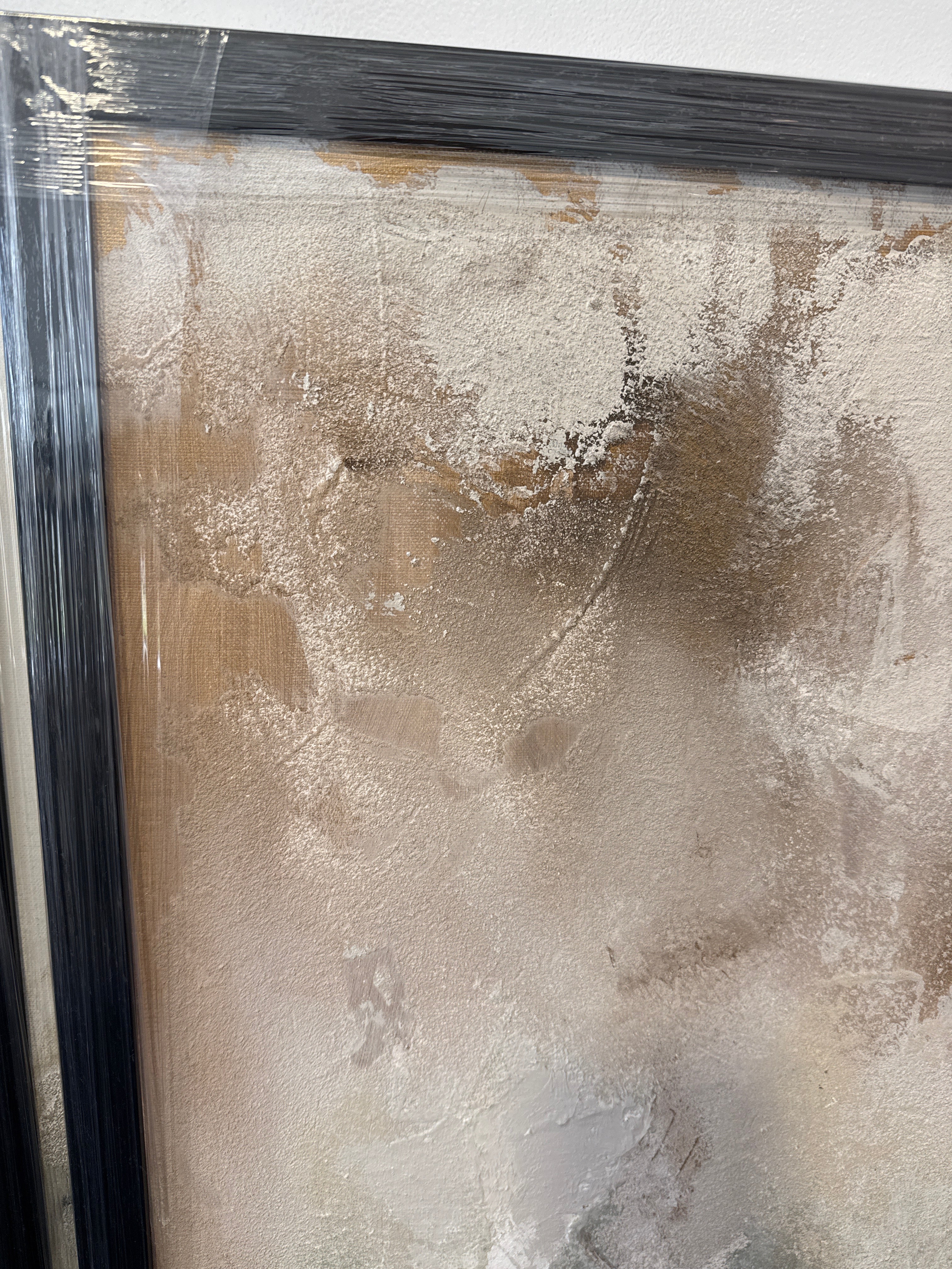 Stunning Bespoke Hand painted canvas by our talented in house artists , Textured and sculpted neutral light base with deep gold and bronze accents , framed in our trademark black wooden frame , ready to hang !