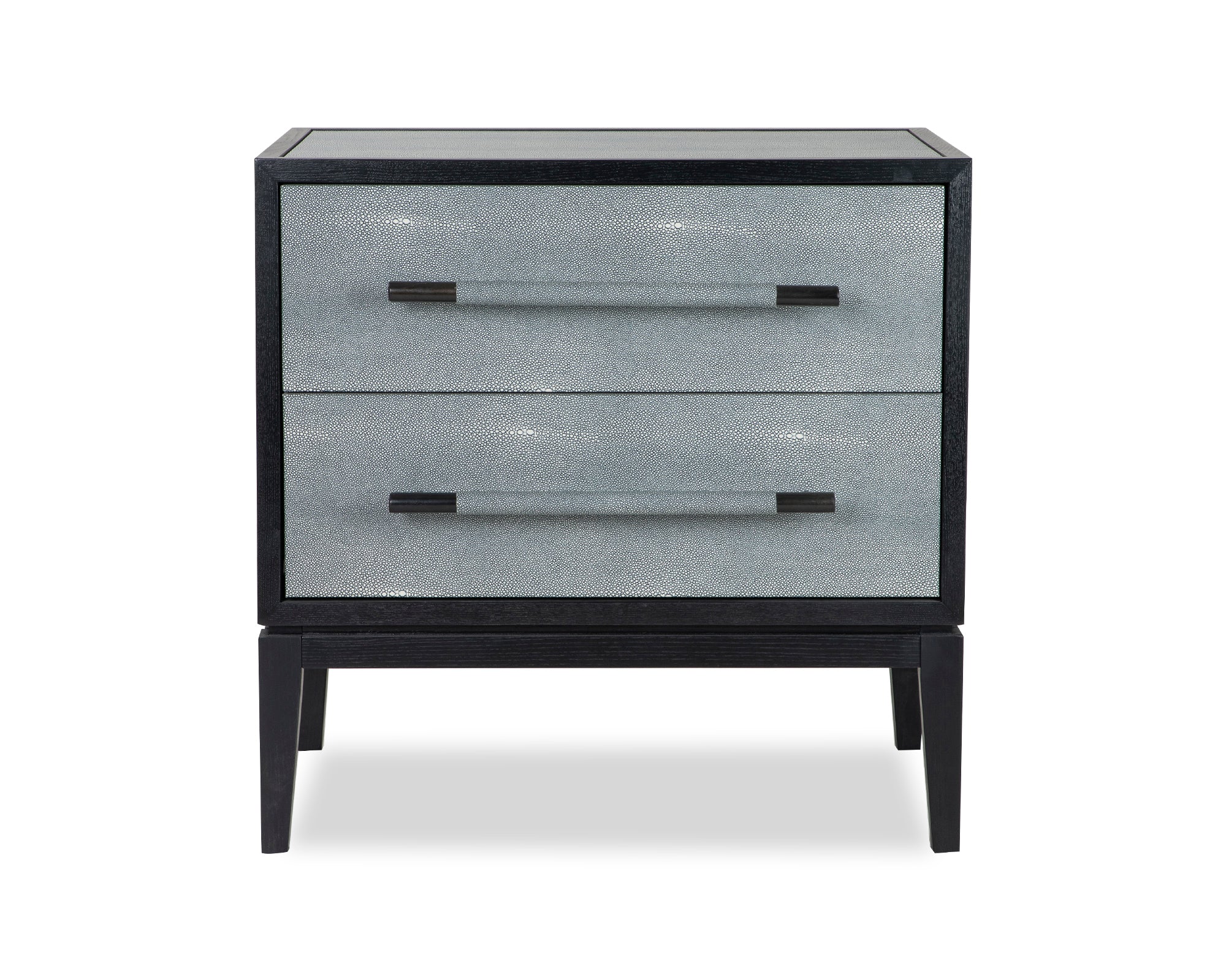 Elevate any interior with a Bologna bedside table. The cool grey faux shagreen look provides a contemporary look that enhances your bedroom space. Popular for its beautiful style, this bedside table offers complete comfort and individuality. Matching shagreen handles and a black ash veneer frame bring the whole together.