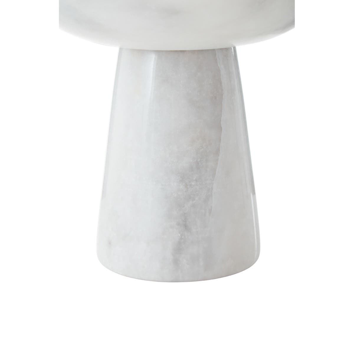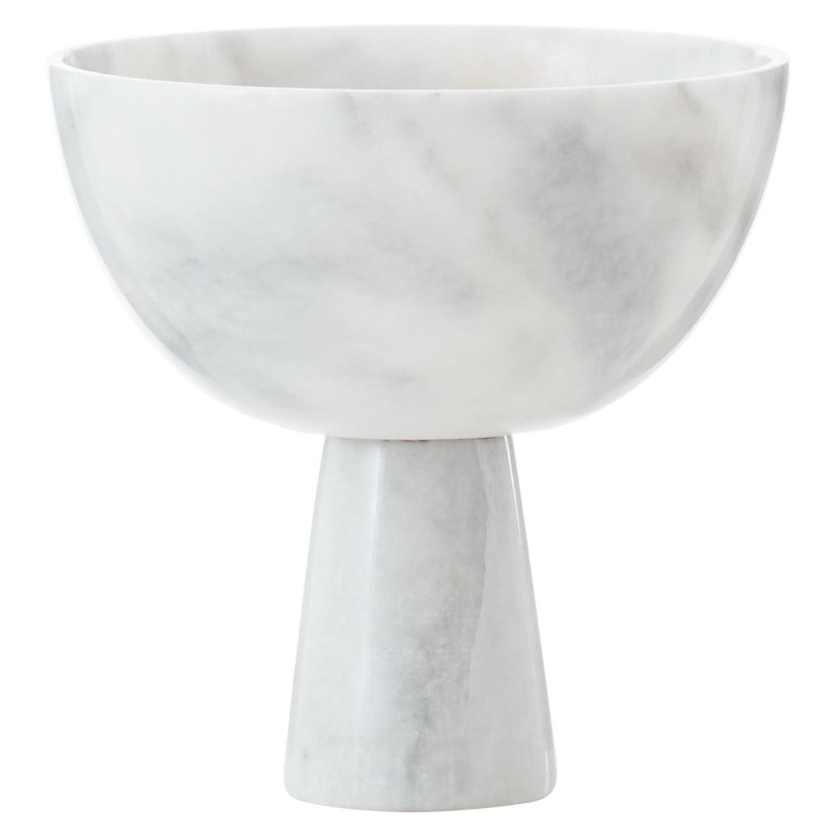 This white marble pedestal bowl has faint, grey veining throughout, which compliments a variety of interiors. The solid bowl sits on top of a conical style base, which adds both stability, for functionality, and enhances the contemporary aesthetic.