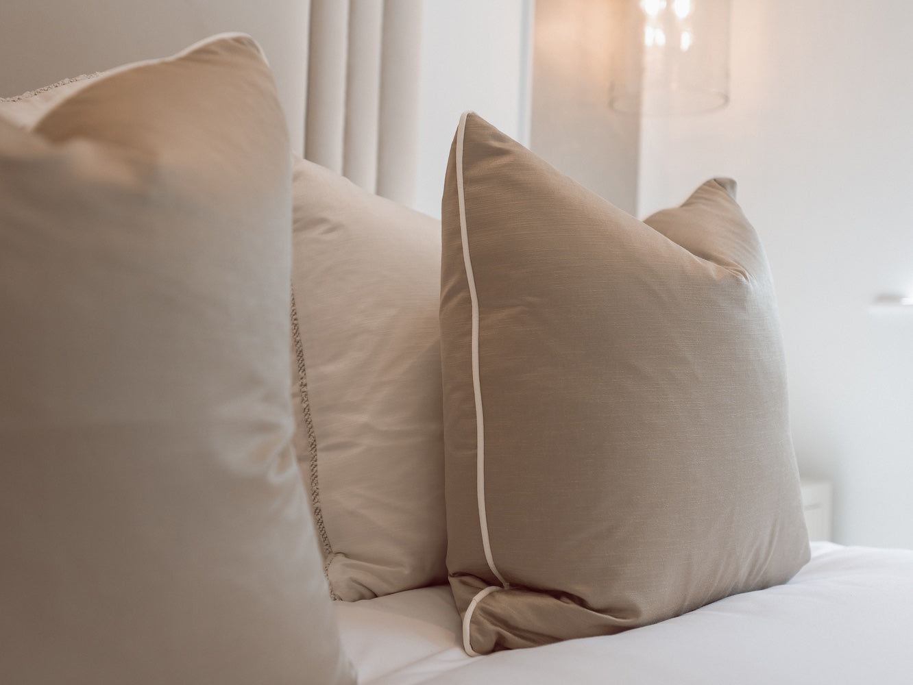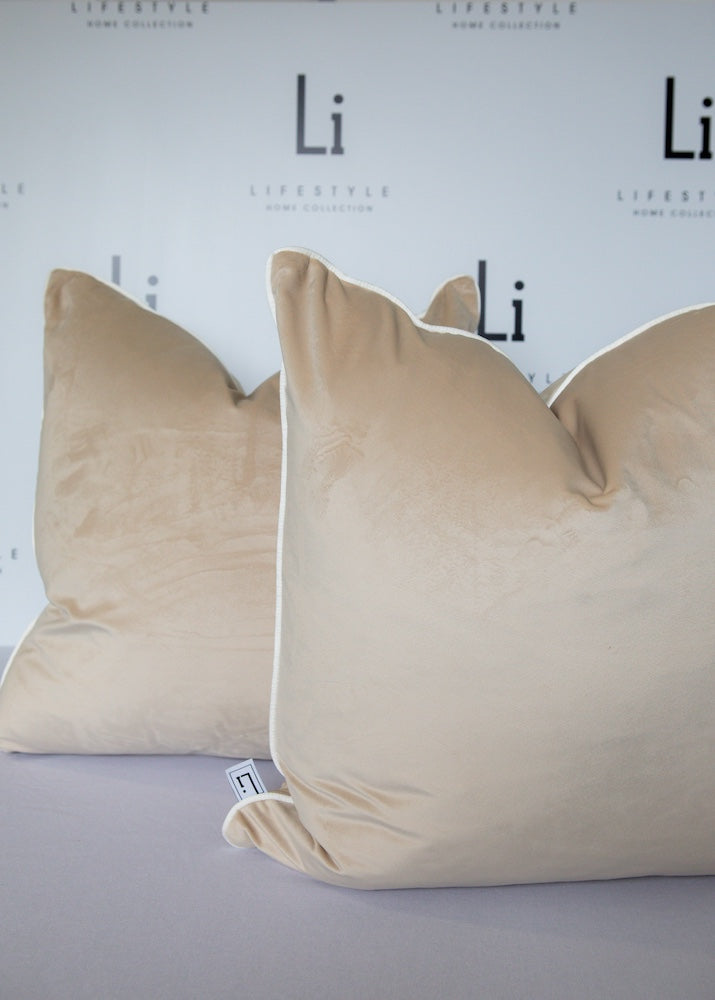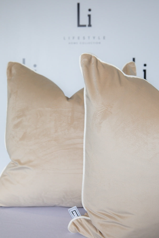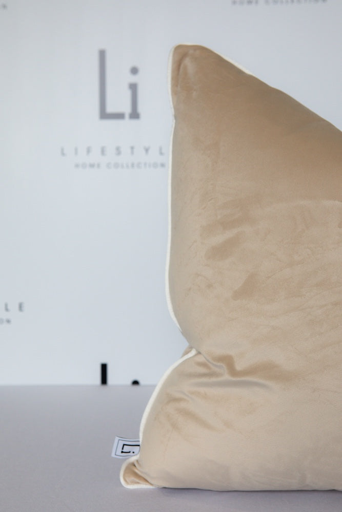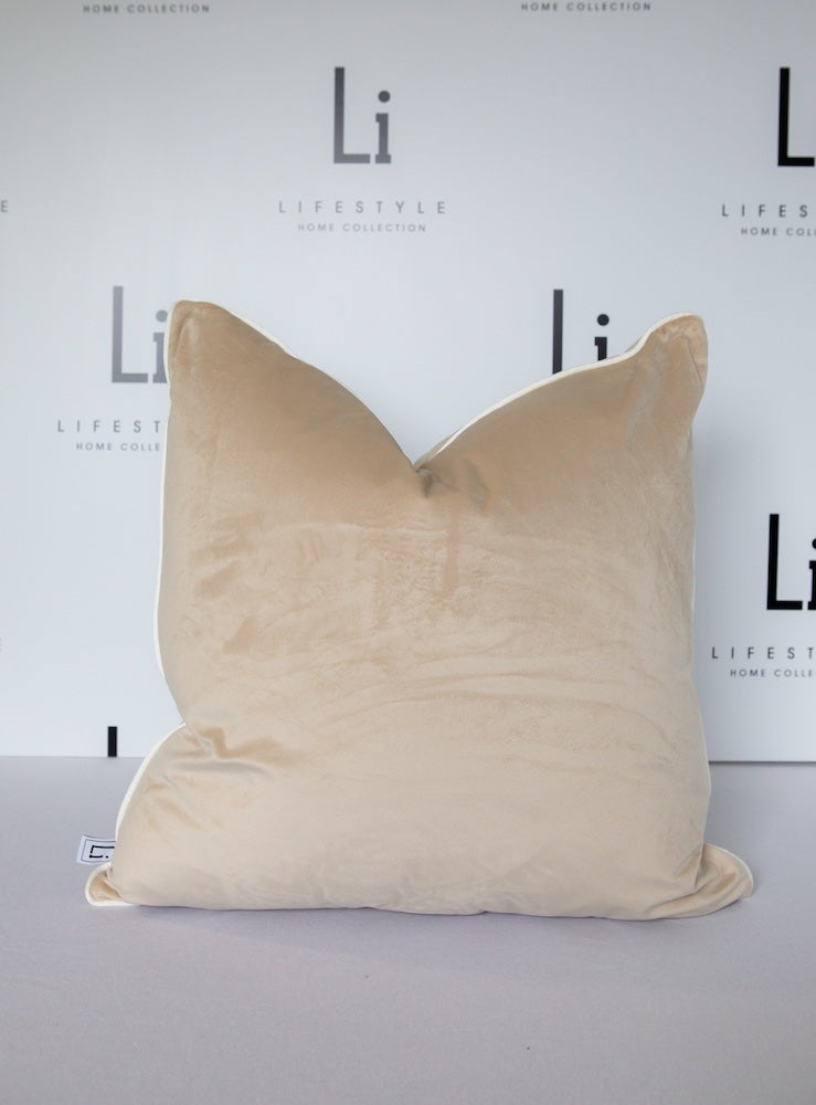 This cushion is crafted from a sumptuous velvet, offering a touch of opulence and comfort to any room. The velvet fabric, in a rich yet neutral shade, exudes sophistication while seamlessly blending with a wide range of interior styles. The cushion's edges are finished with meticulously detailed piping, enhancing its refined look and providing a subtle contrast that underscores its high-end appeal.