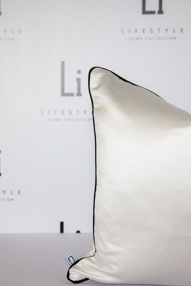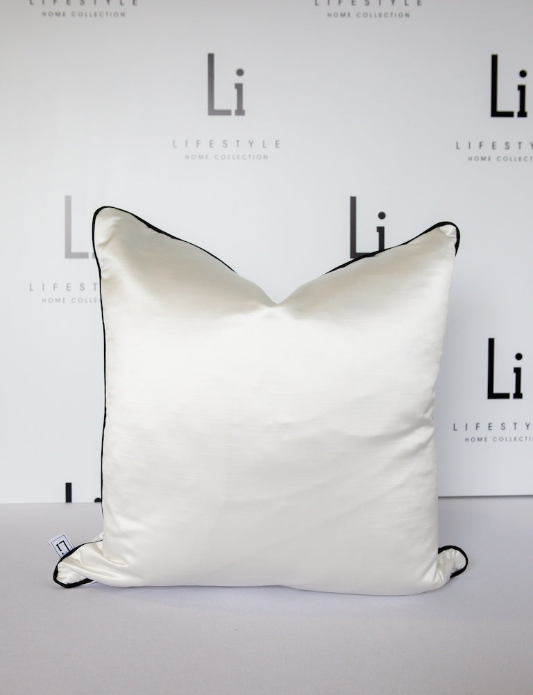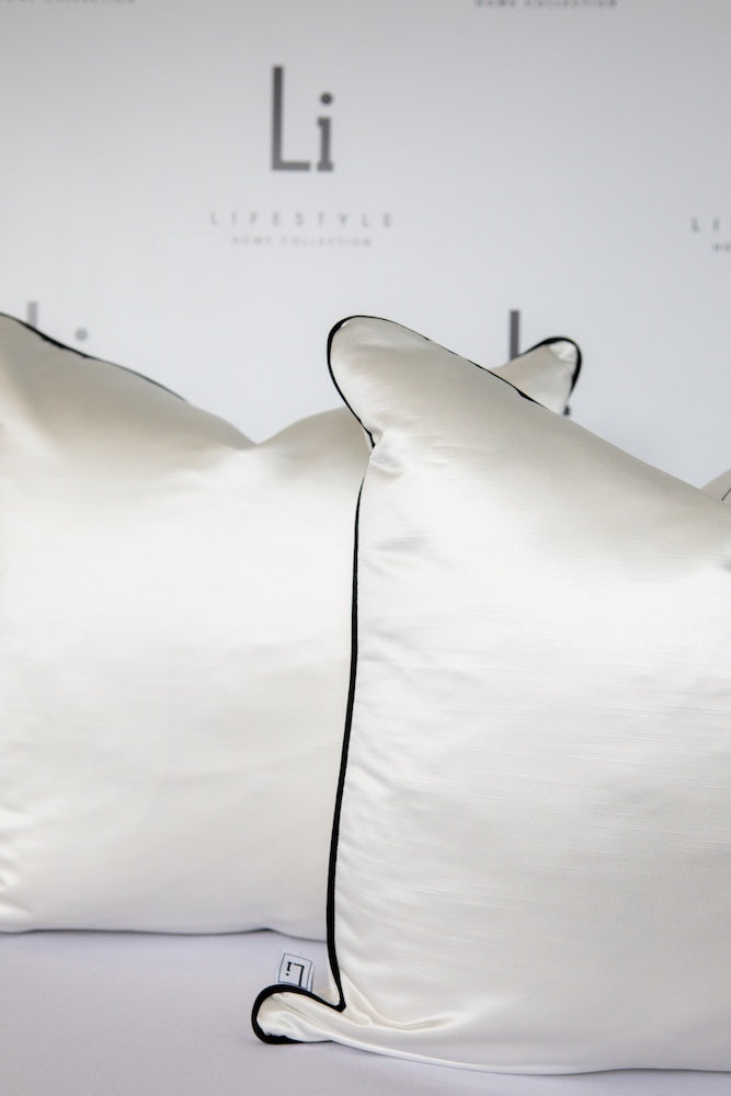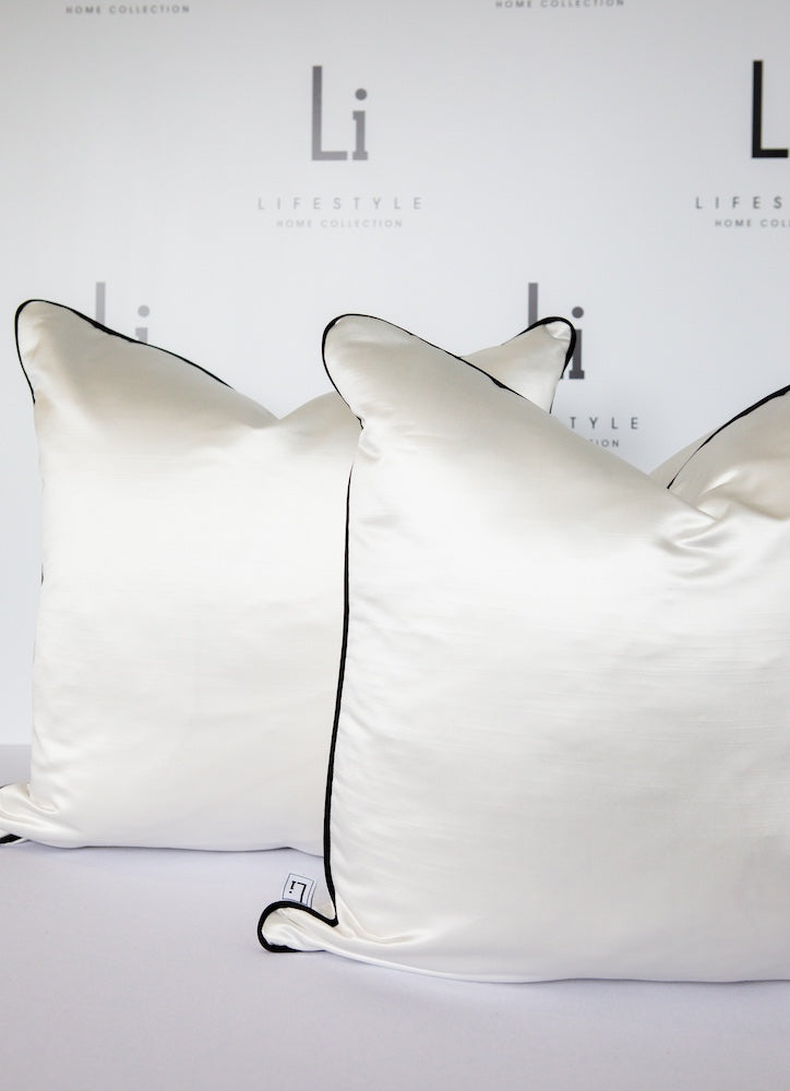 The Grace cushion exudes elegance and luxury in its monochromatic scheme. An opulent white, smooth satin fabric is used to seamlessly integrate this cushion into your home. This is completed with the contrasting black velvet cushion piping, which adds a refined detail that enhances the overall luxurious appeal. Providing a timeless and versatile aesthetic, this sumptuous cushion is perfect to add comfort and style to your home.