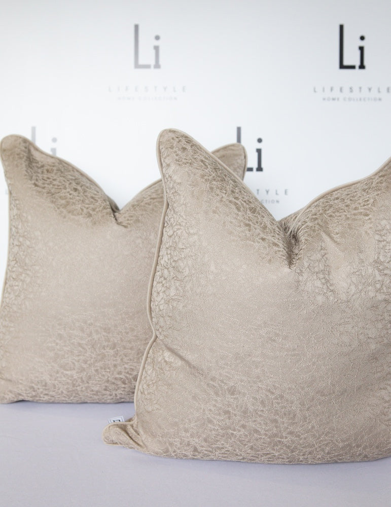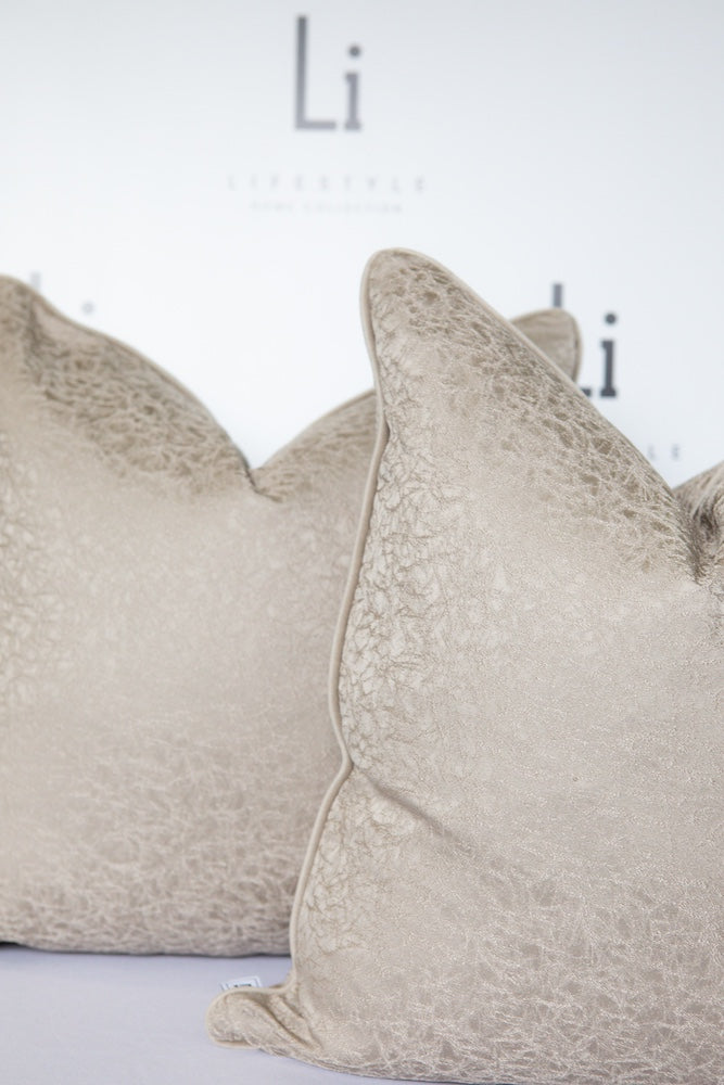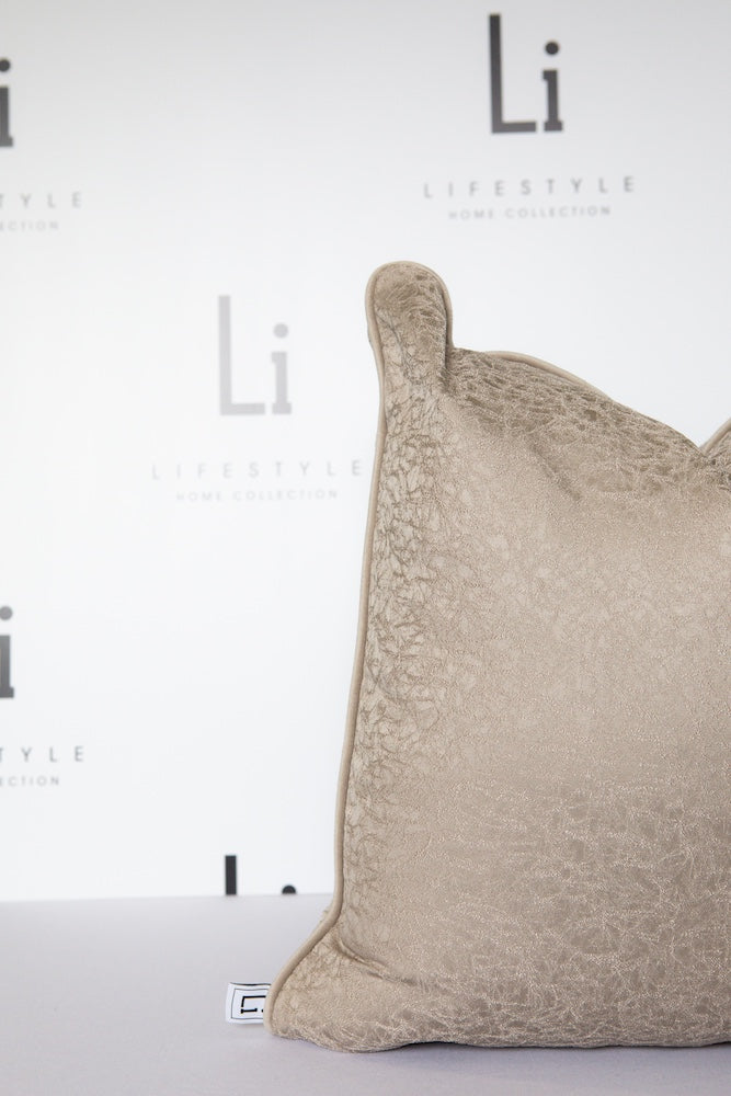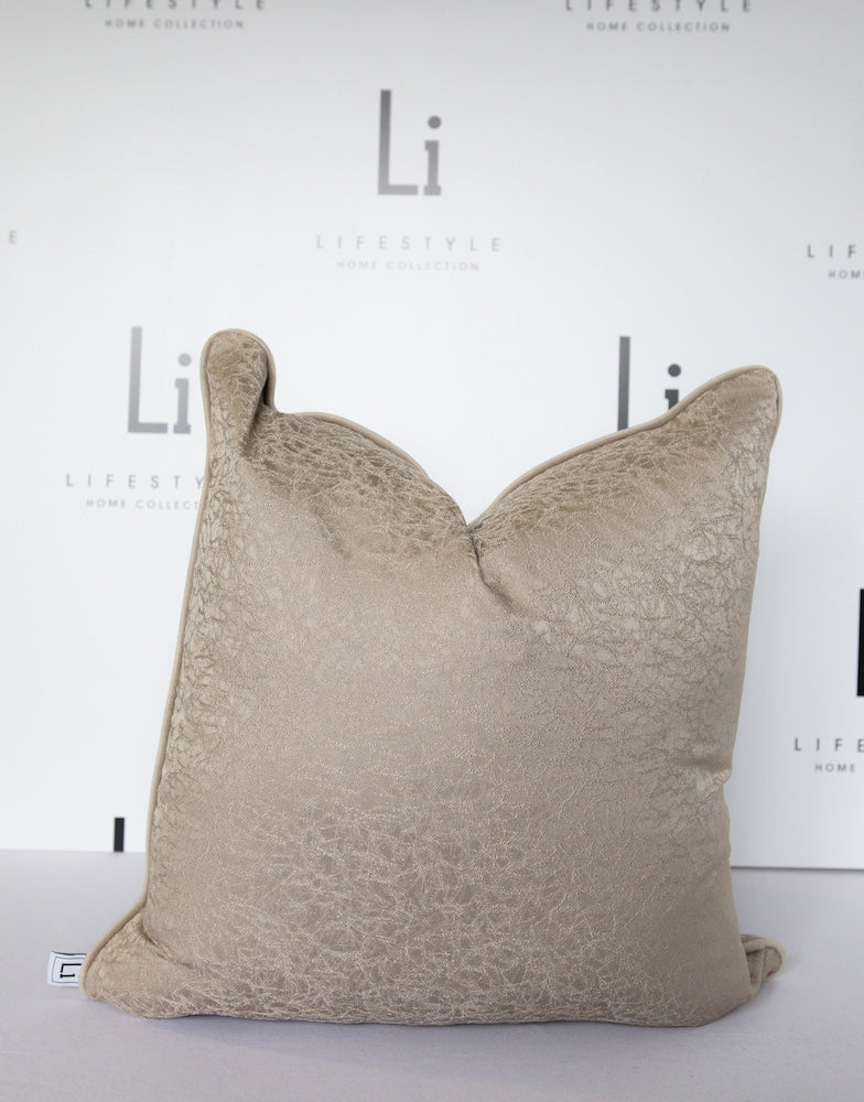 The Isabella cushion is a luxurious addition to any space, crafted from a textured satin fabric in a sophisticated taupe hue. The satin surface features a subtle, elegant sheen that catches the light, enhancing its rich appearance. The cushion is edged with matching velvet piping, which not only adds a touch of opulence but also provides a smooth, contrasting texture against the satin.
