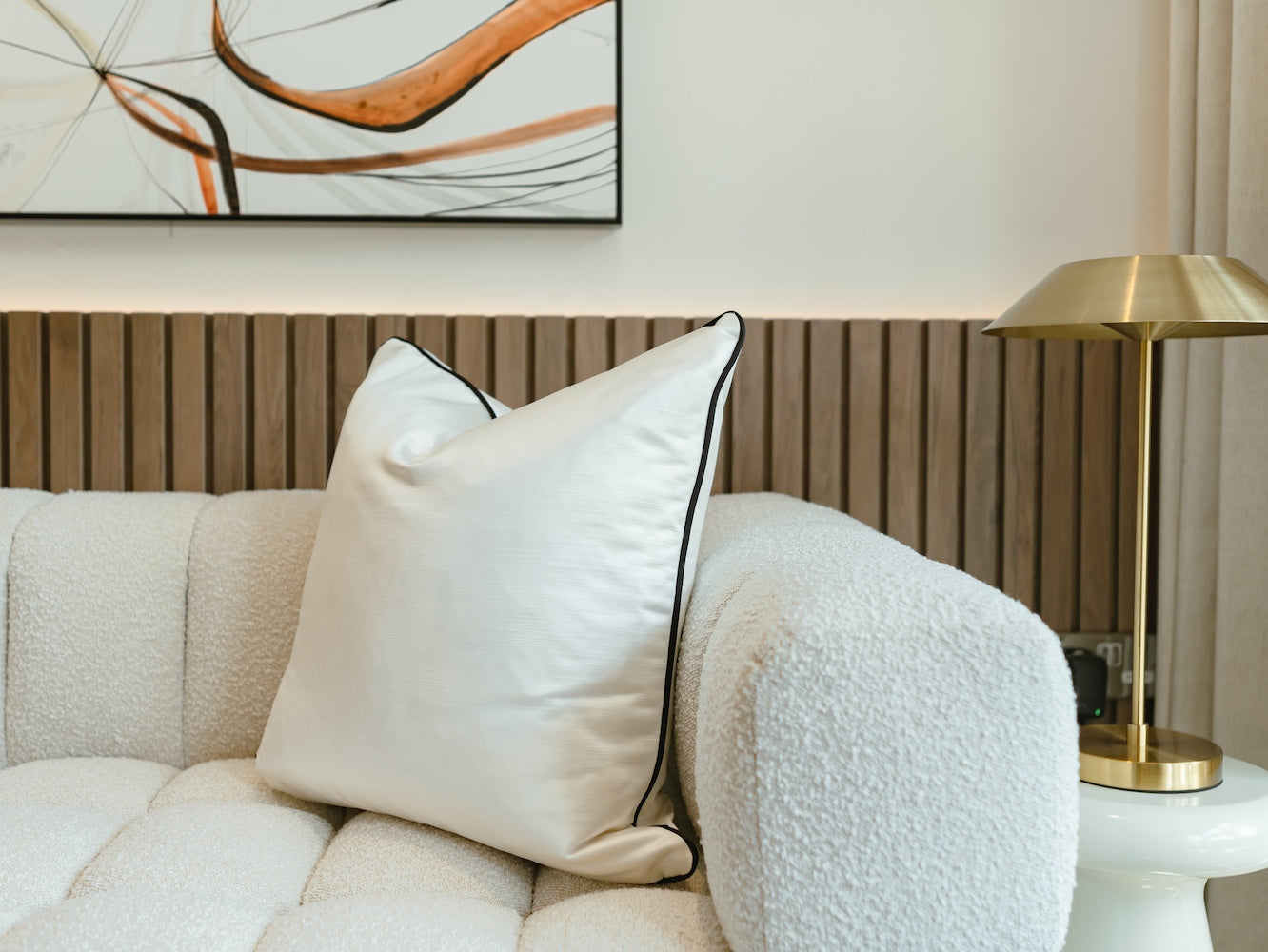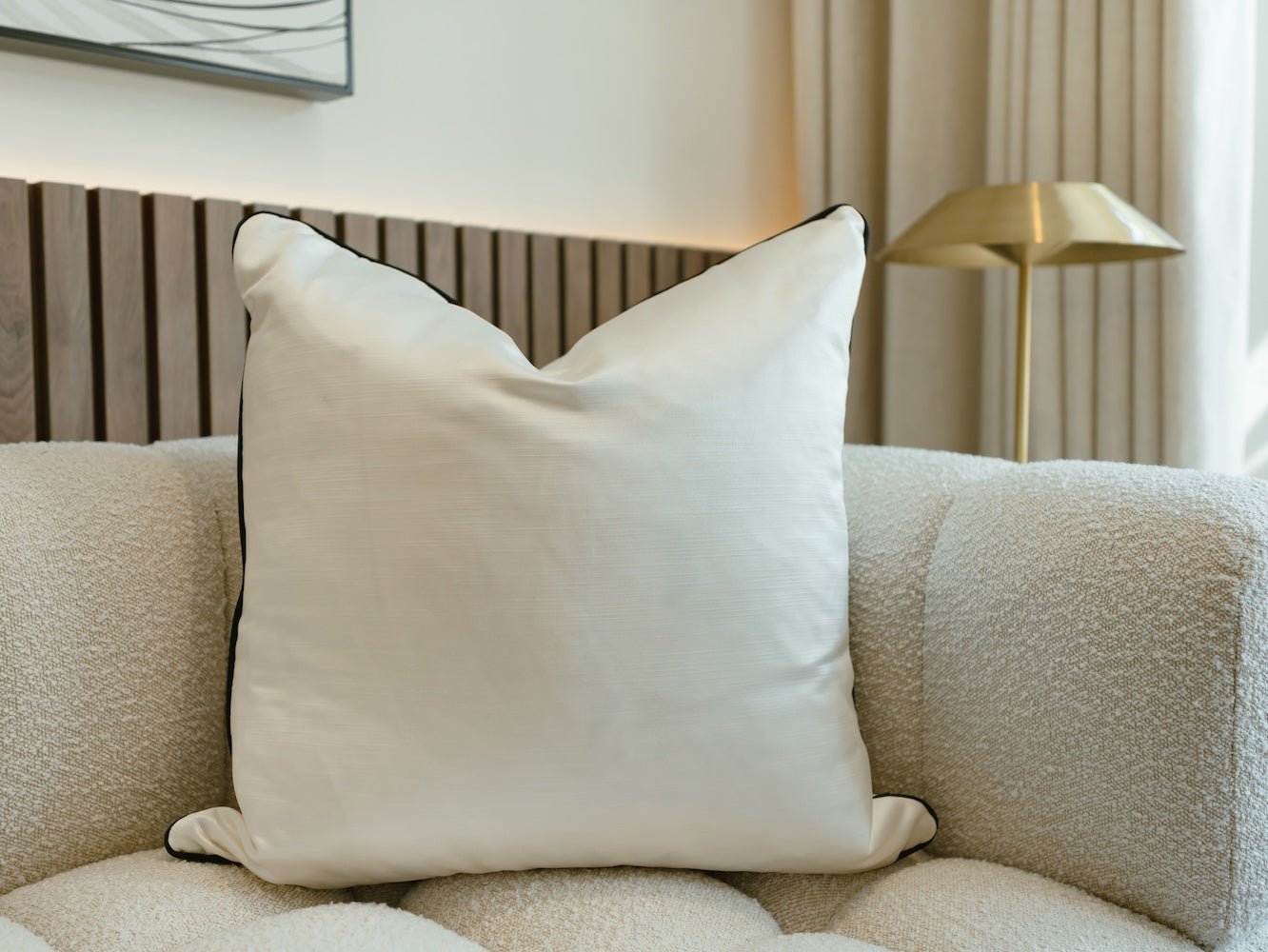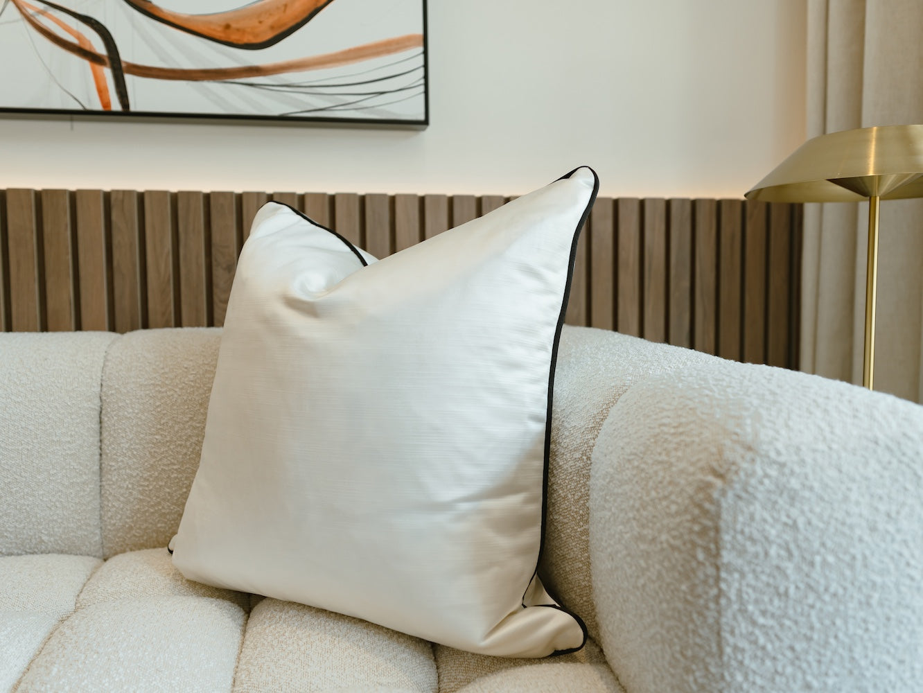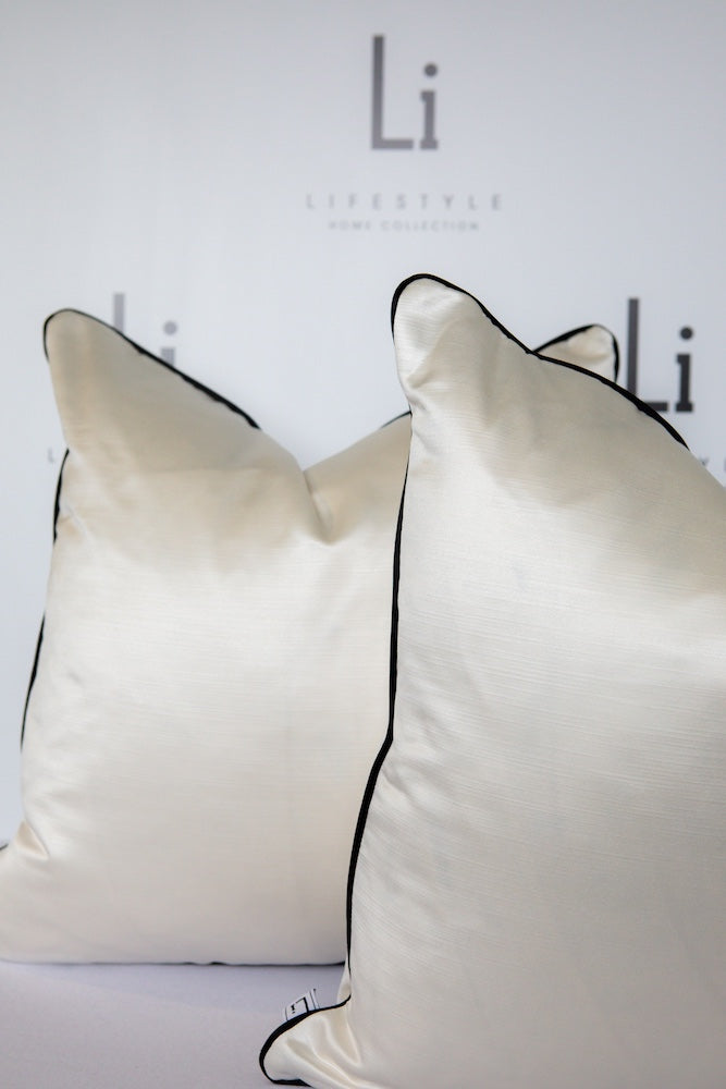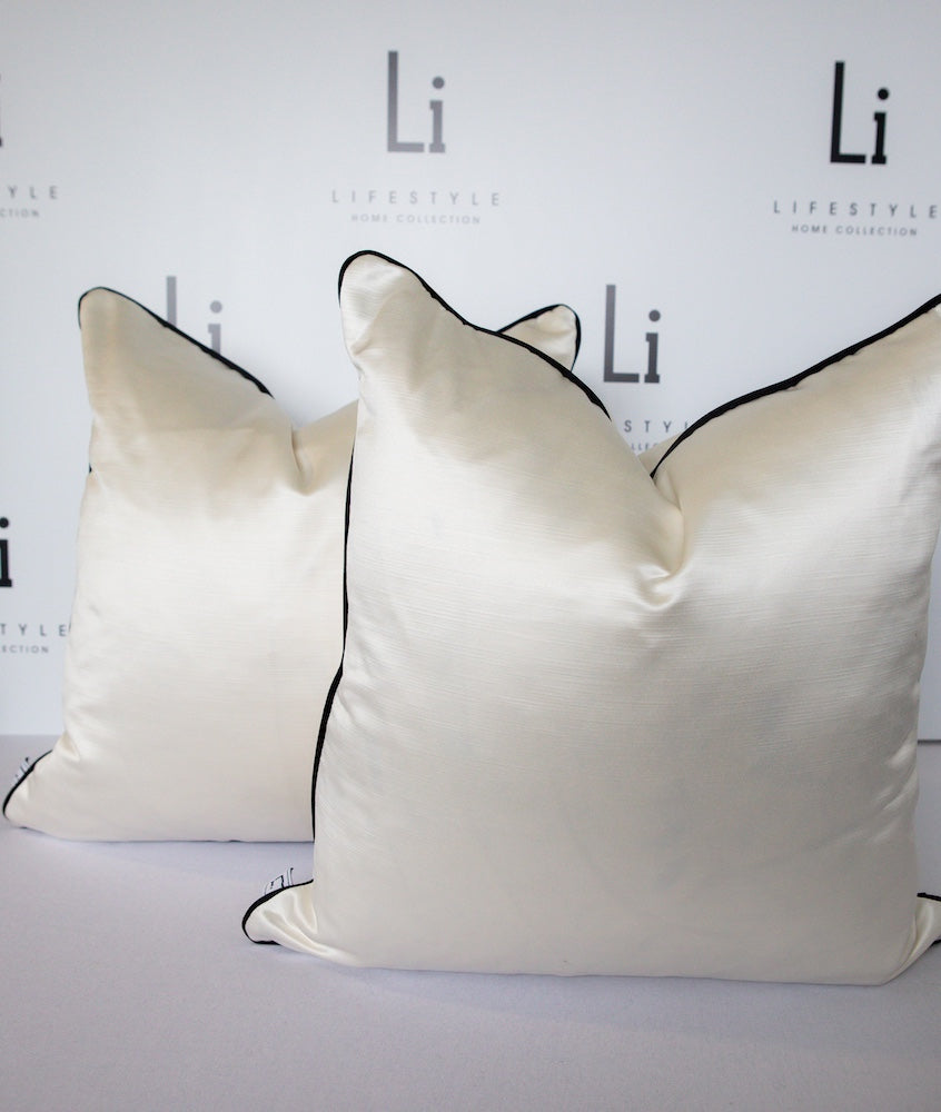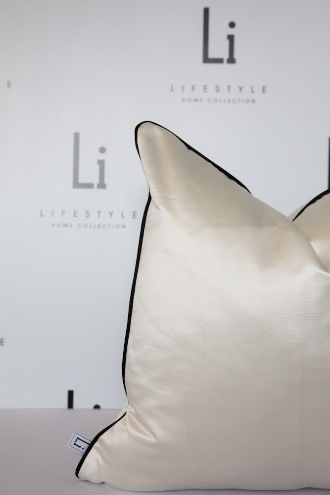 The Ivy cushion is elegant and luxurious, whilst showcasing a monochromatic style. A smooth, ivory, satin fabric is paired with black, sumptuous velvet, cushion piping, which creates an opulent look. This cushion will seamlessly integrate into your home, providing a luxurious, timessless and versatile look.