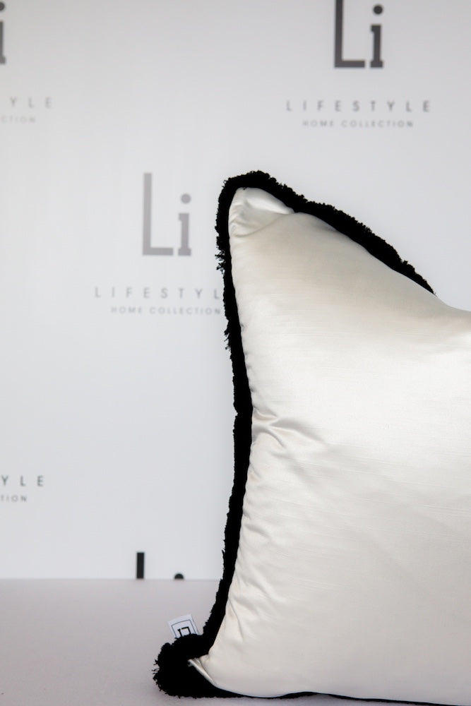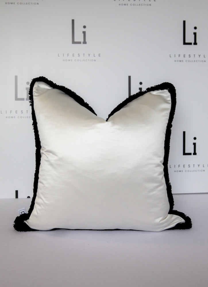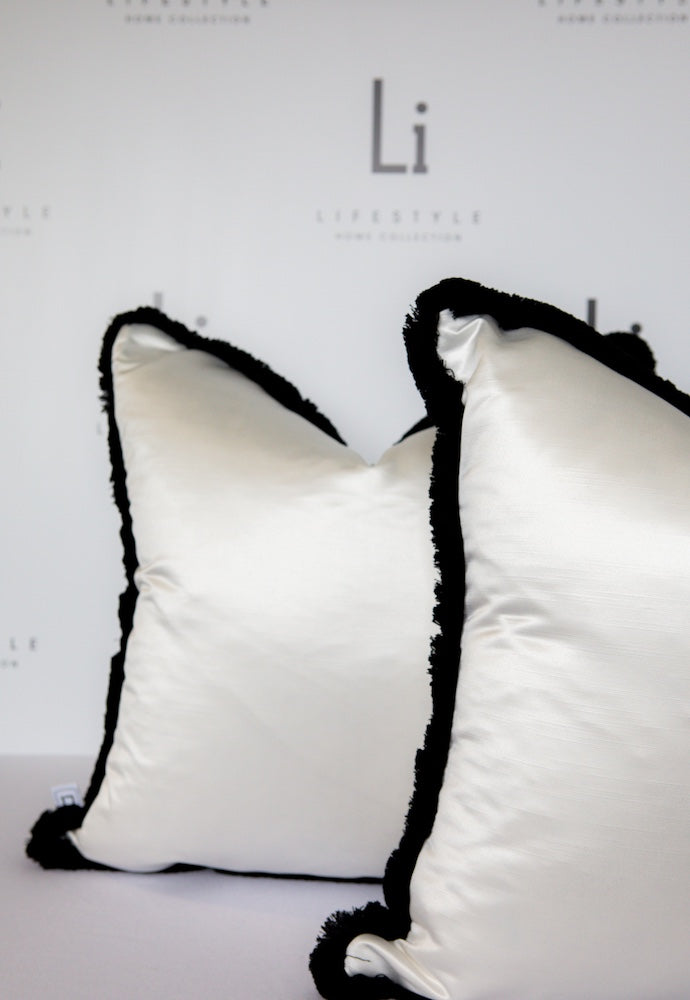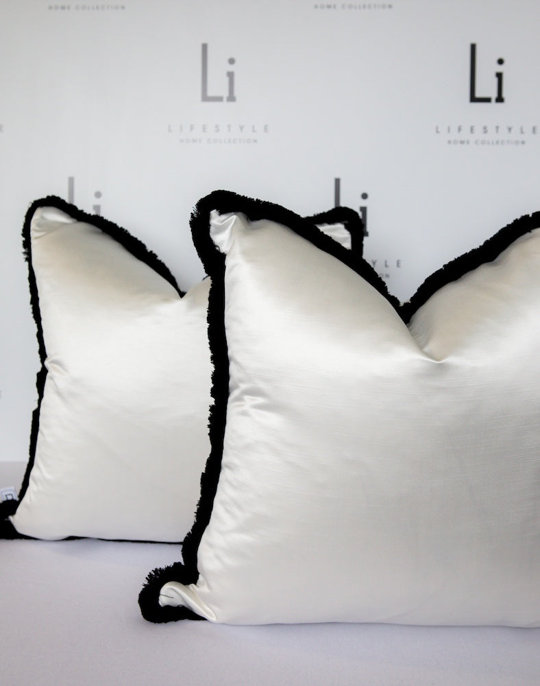 The Mia cushion exudes timeless elegance with its classic black and white colour scheme. The cushion is crafted from a high-quality fabric, offering a smooth, sophisticated texture that adds a touch of sheen and reinement to any space. A striking contrast is created between the deep black and crisp white, which creates a bold and modern statement. Adding to the opulent design is a delicate fringe trim, which introduces a layer of intricate detail which enhances the cushions visual, luxurious appeal.