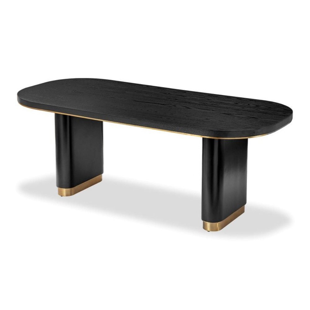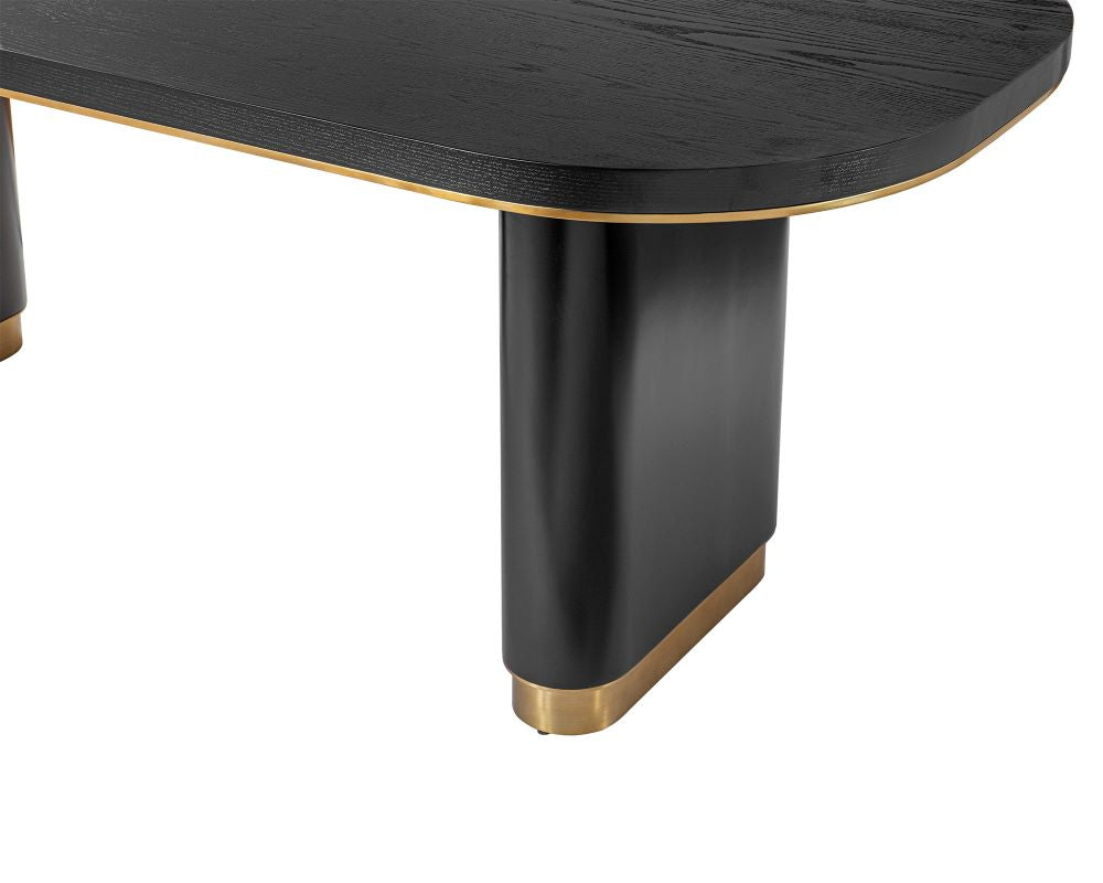 Enjoy a delightful dining experience with the Chaplin dining table. Each artisan is individually crafted from a wooden frame and artfully accentuated by the enchanting ash-black veneer top and beautifully decorated brass trim around the tabletop allowing Chaplin to instantly enrich the aesthetics of your interior aesthetic