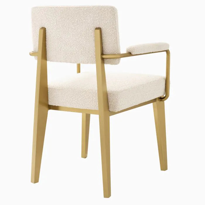 Perfect for your dining area, the Sorbonne dining chair features a beautiful retro design and an elegant stainless steel frame with a brushed brass finish. The cream bouclé back panel, seat and armrests match most modern dining tables.