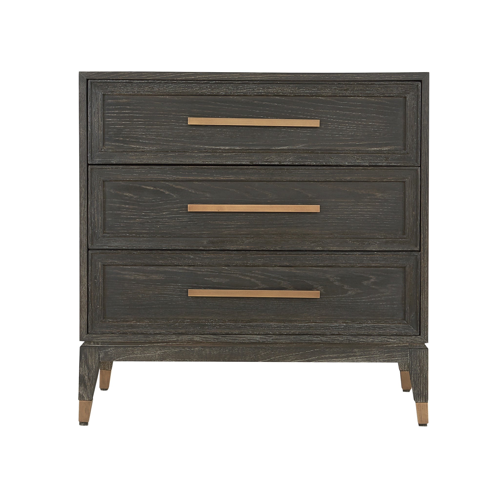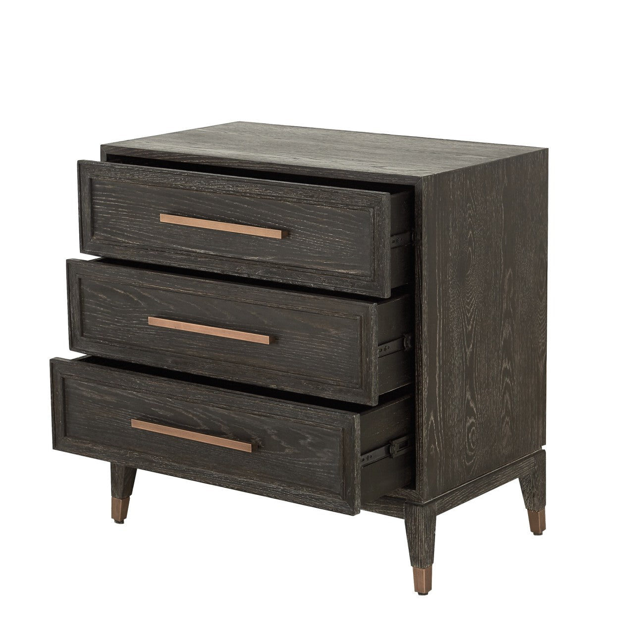 This Renmin 3 drawer chest is an elegant and practical item that you can use in your design scheme. The textured oak is finished in our signature carbon color in dark and dramatic neutral tones. Gold-plated metal details and handles are designed to complement the oak wood for understated detailing. His Renmin 3 drawer dresser made of carbon oak wood features his 3 drawers with tiered detailing and gold-plated metal handles. The gold-plated metal details are still intact, and the leg of the Renmin chest has matching "socks".