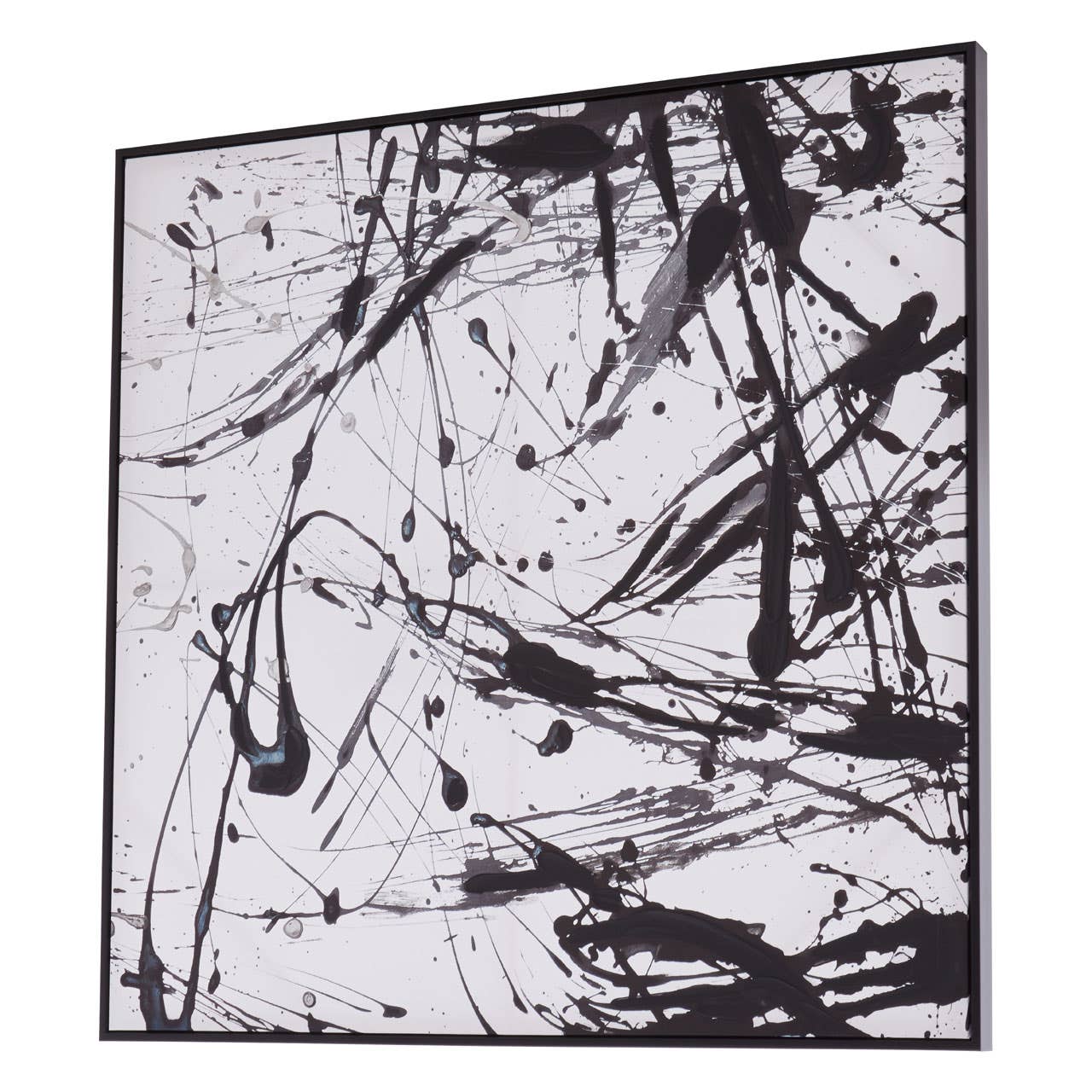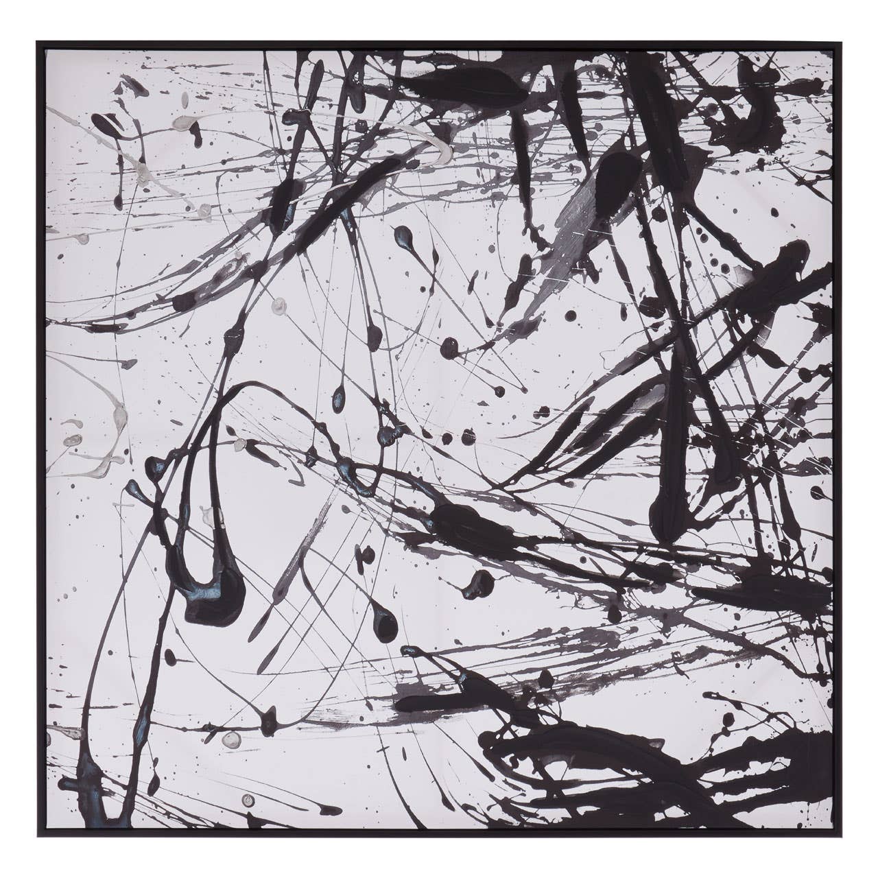 This vast oil painting is comprised of a white canvas displayed in a frame crafted from natural wood. The canvas is decorated in a monochromatic pattern, where the stark black strokes contrast directly against the bright white. Splashes of gold are interspersed to add warmth to the oil painting, whilst the frame is black to coordinate the minimal design.