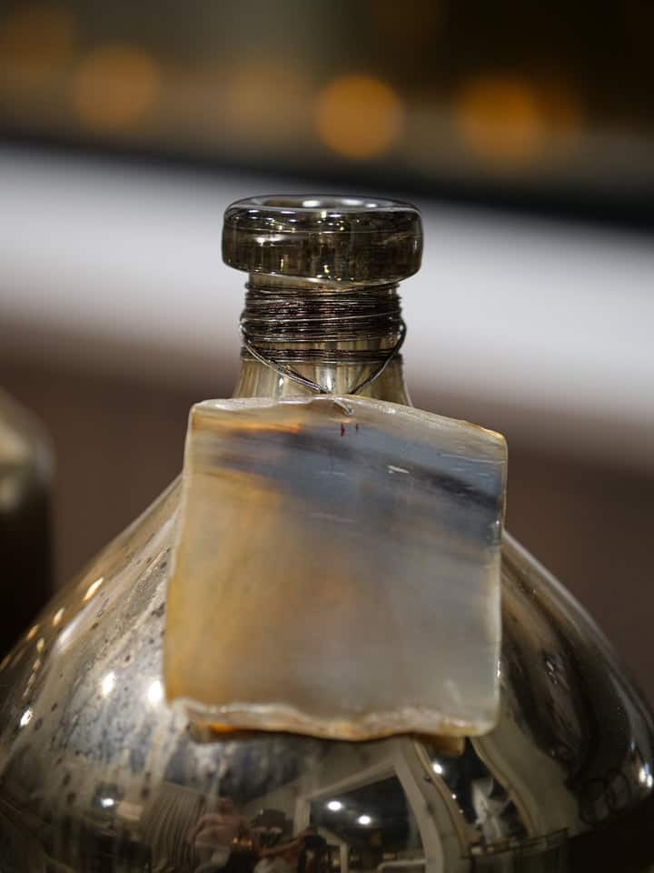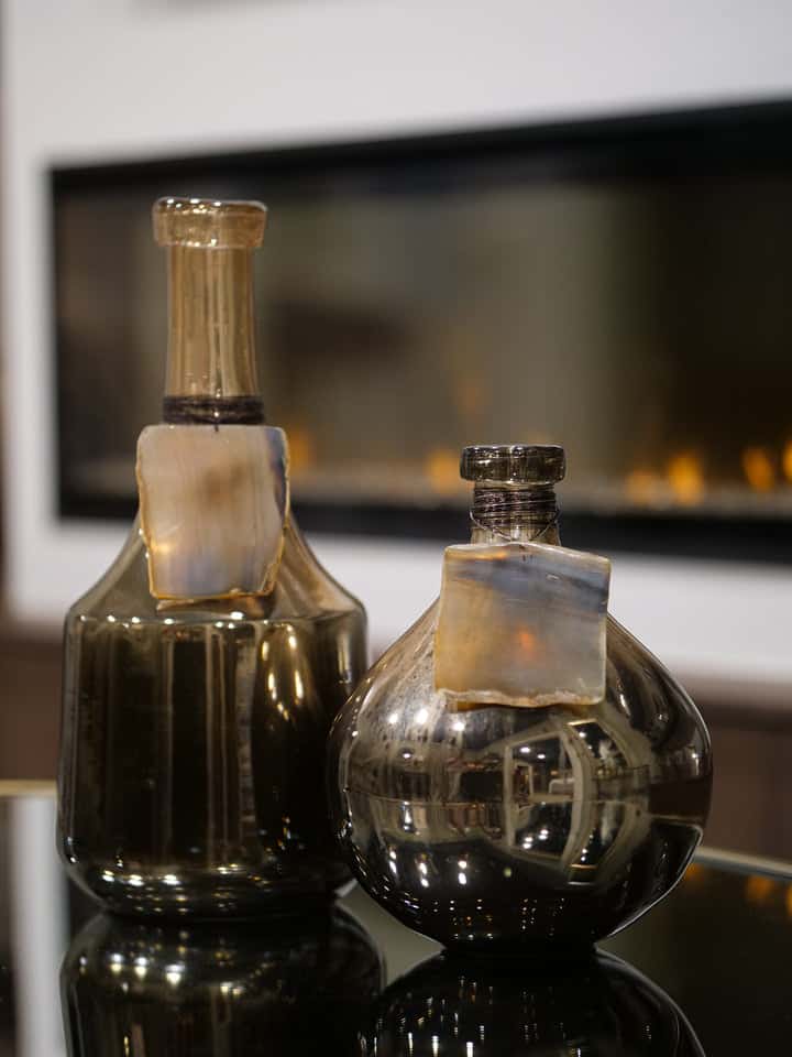 This decorative bottle is glazed with a rounded effect and statement medallion. Made with antiqued gold and amber tones, this accessory adds luxury to any space that it is placed in. Perfect to place with the Alvar Bottle.