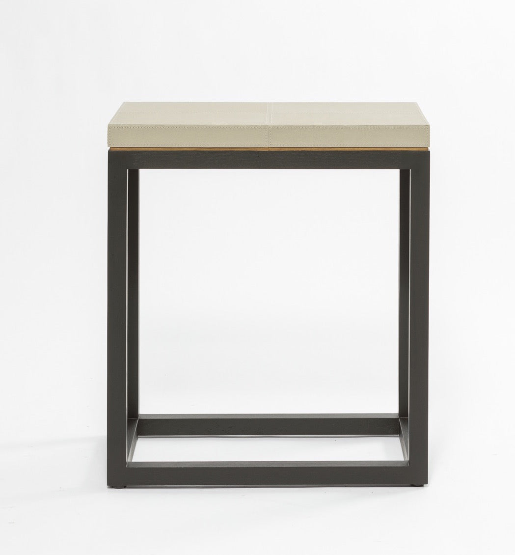 The Linea D'Oro side table in French grey leather conveys a luxurious feel with its intricate textures and eye-catching details. The name comes from the gold leather shadow line between the French grey leather top and base.