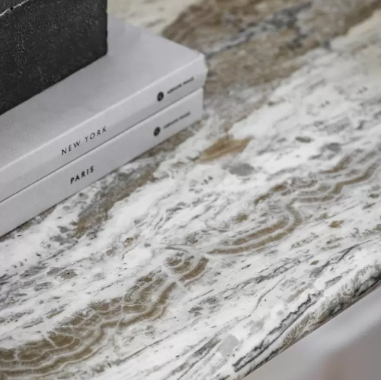 Adding this console table to your home will make for a sophisticated and elegant feeling brought to your space. Featuring a grey/green marble faux finish top, this is paired with the bronzed brass finish metal legs to give an understated luxury style. Perfect for any classic, luxury or modern interior.