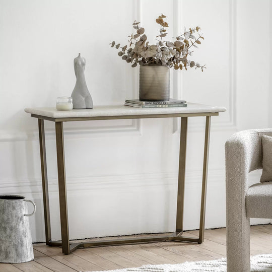 Add a touch of sophisticated elegance, with the Moderna range. A feature, faux travertine finish top adds a touch of luxury to the piece, which is complimented perfectly by the classic brushed brass finish legs and and base.