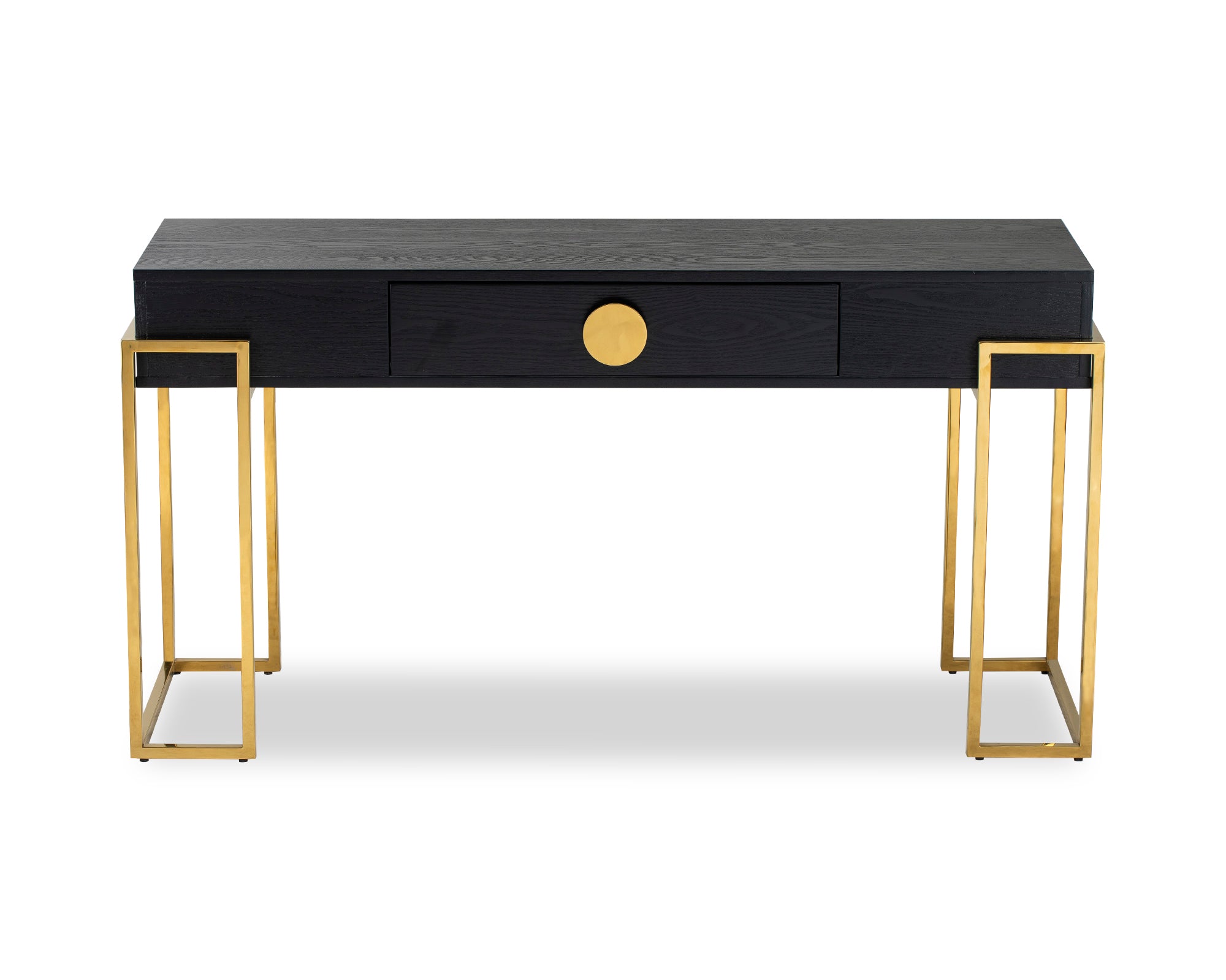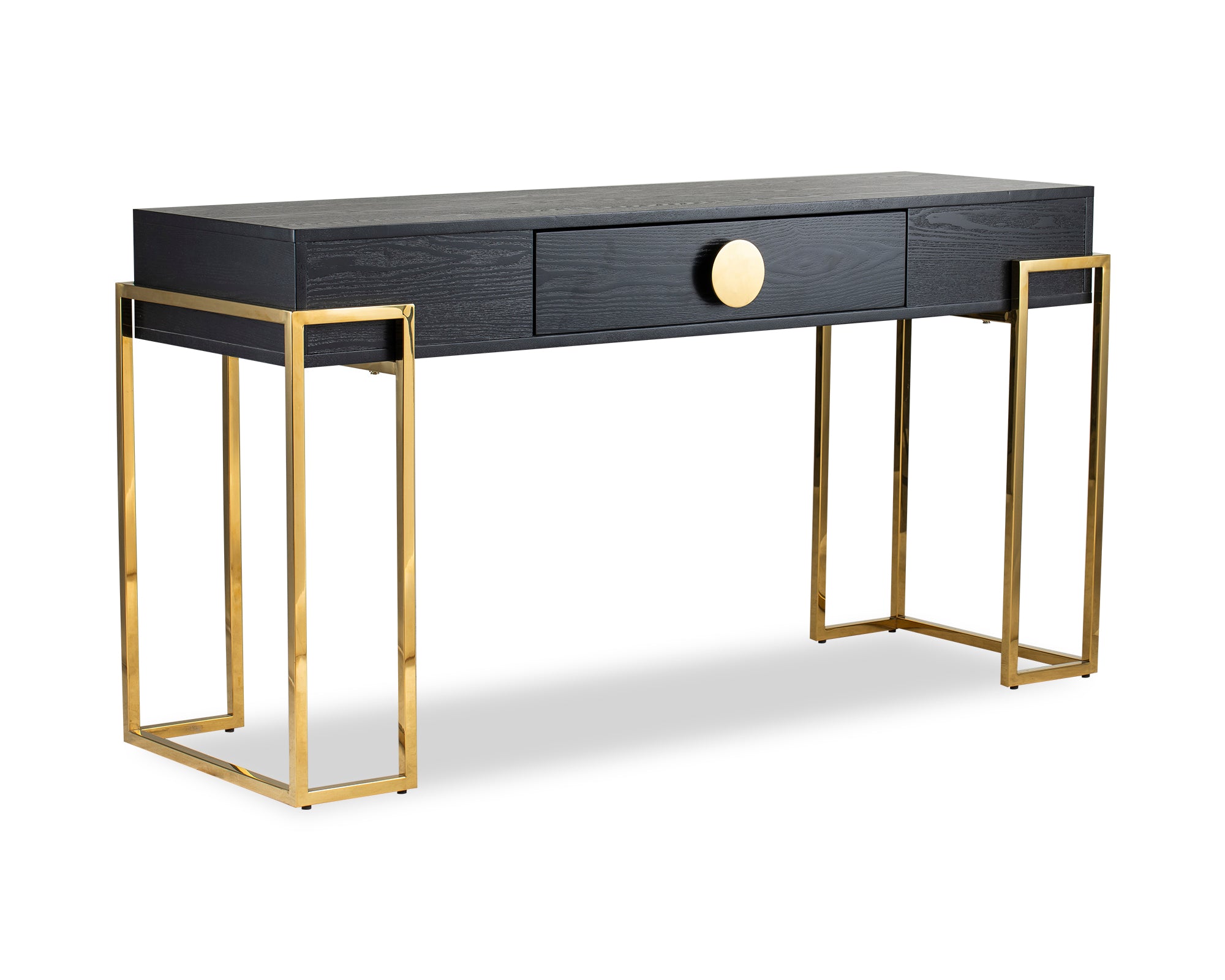 Simple yet striking, the Paradigm Console Table is a classic design that's perfect for a hallway, dining room, or behind a freestanding sofa. Black ash veneer contrasts with angular abstract polished brass legs complemented by eye-catching round handles.
