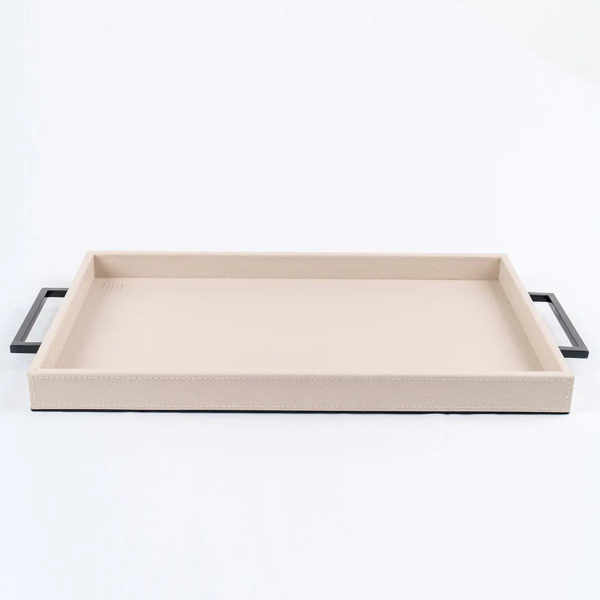The Barrington Tray Pumice Leather is covered in luxurious leather and features elegant leather wrapped handles. All our trays use real leather with the base lined in a black piquet. These materials offer a sense of opulence with their intricate textures and unquestionable quality.