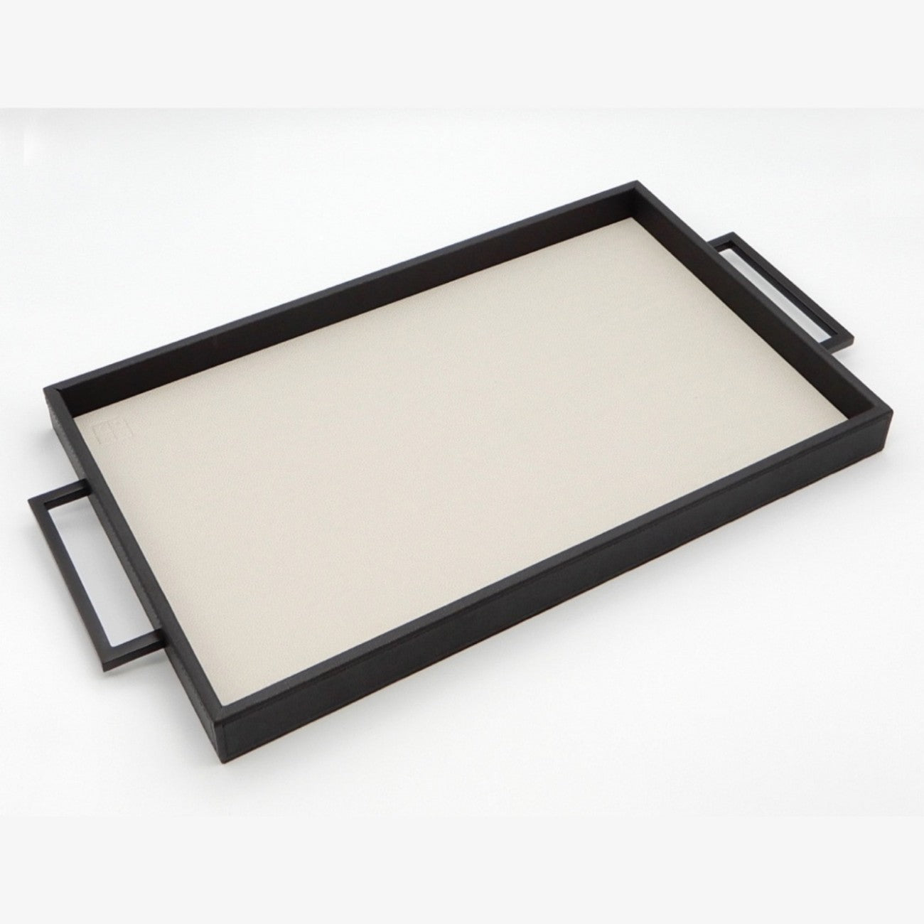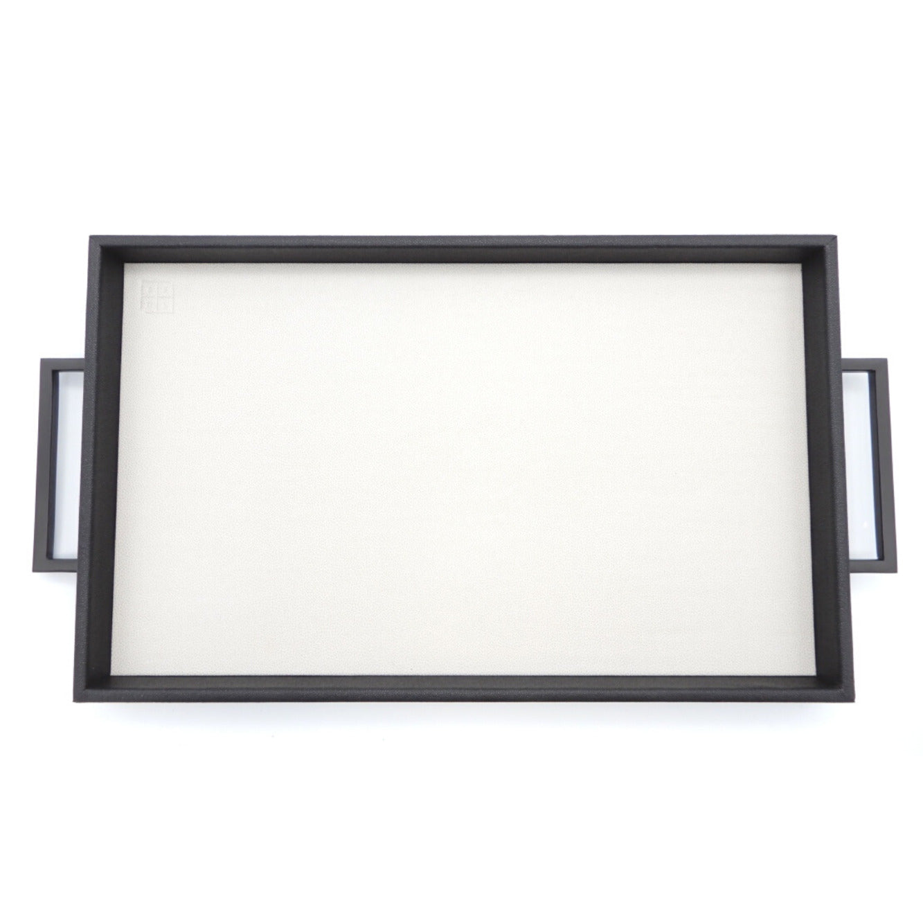 The Barrington Tray Pumice Leather is covered in luxurious leather and features elegant leather wrapped handles. All our trays use real leather with the base lined in a black piquet. These materials offer a sense of opulence with their intricate textures and unquestionable quality.