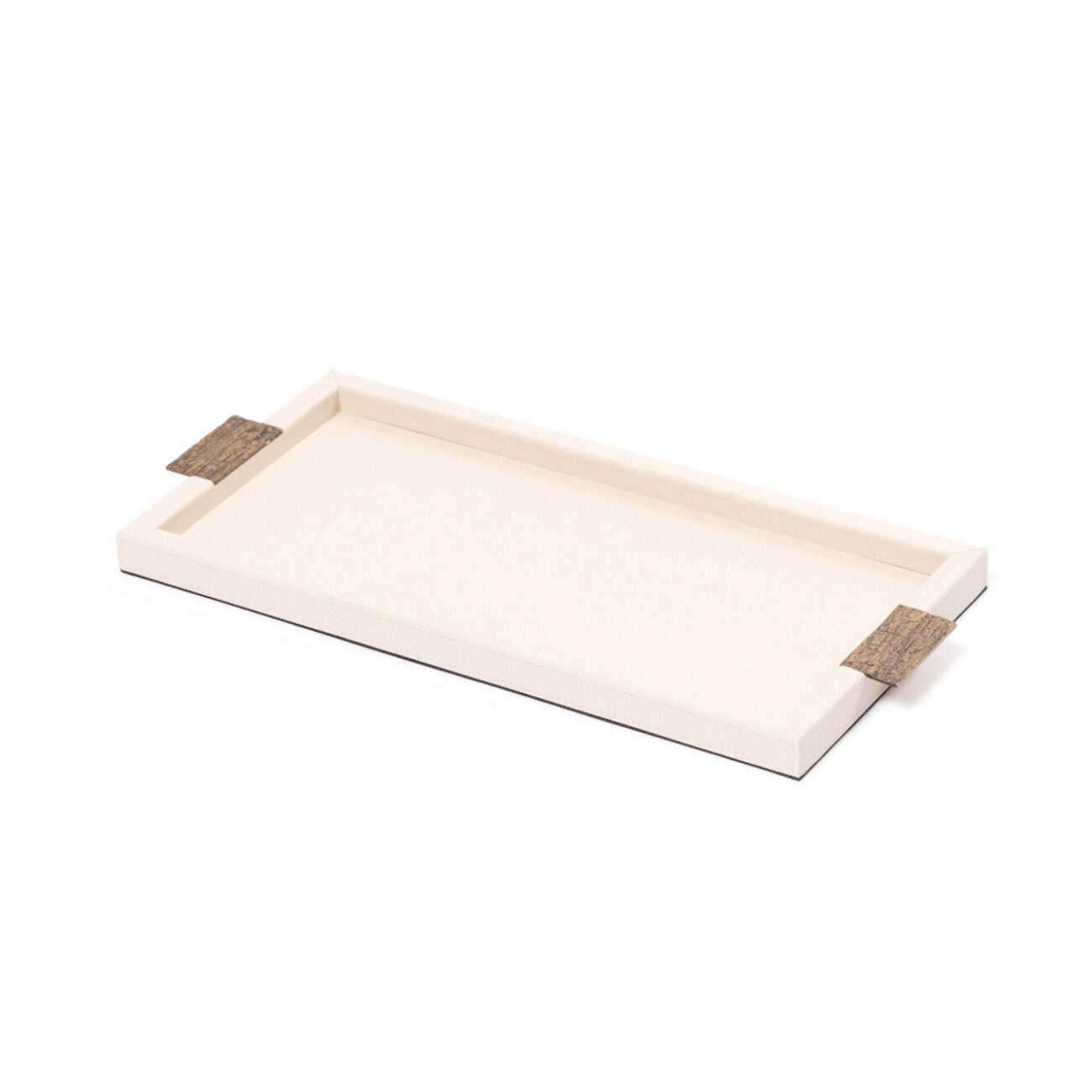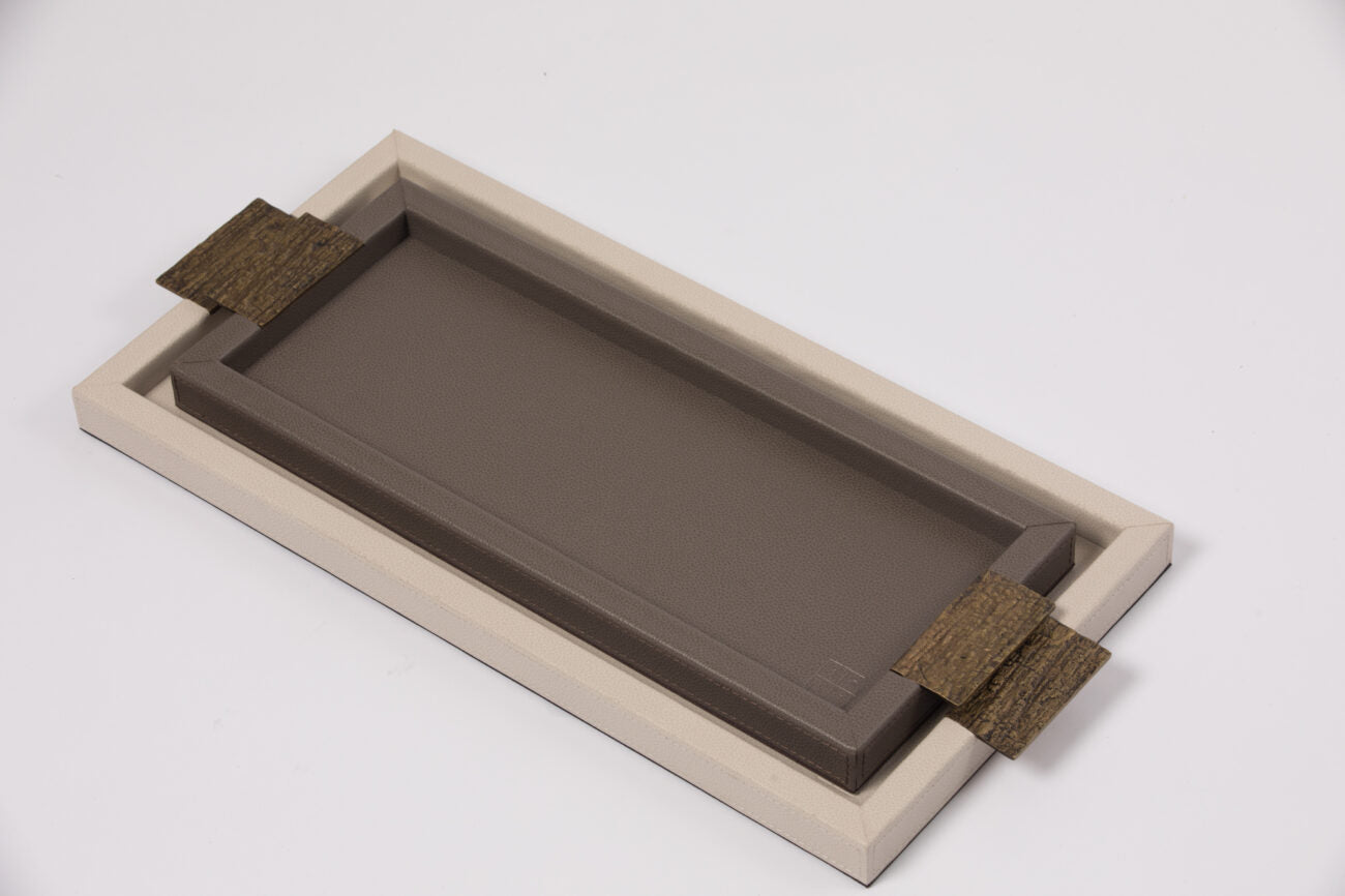 The Wode Tray Rectangle Pumice Leather is covered in luxurious leather and features elegant hand cast bronze handles. The Wode Trays are available in a selection of sizes and leather choices.