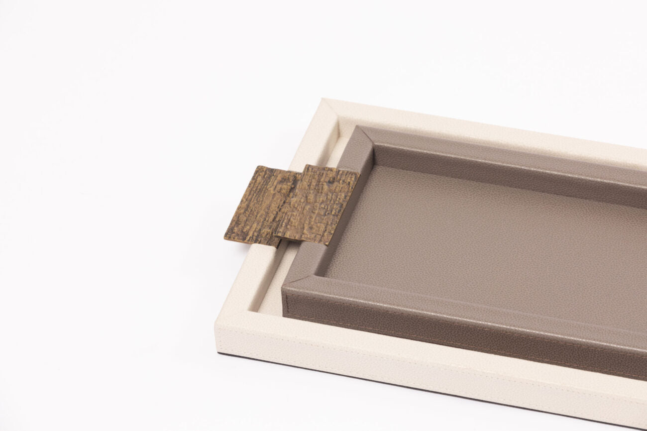 The Wode Tray Rectangle Pumice Leather is covered in luxurious leather and features elegant hand cast bronze handles. The Wode Trays are available in a selection of sizes and leather choices.