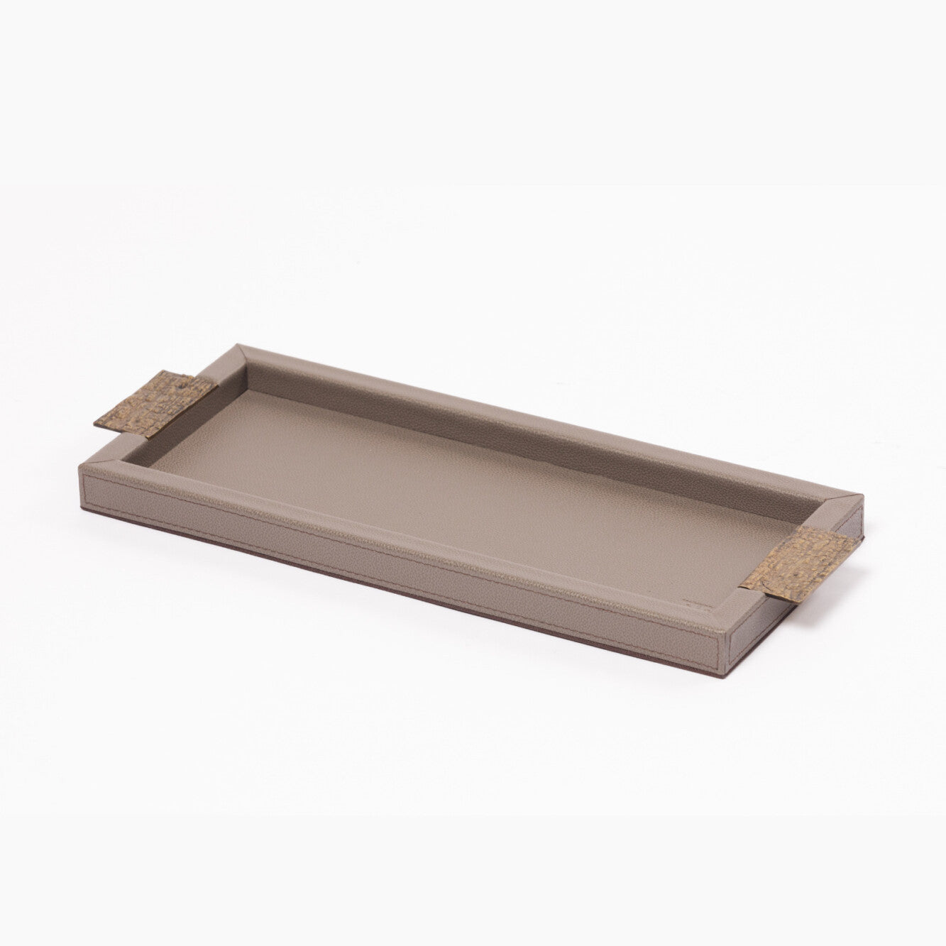 The Wode Tray Rectangle Putty Leather is covered in luxurious leather and features elegant hand cast bronze handles. The Wode Trays are available in a selection of sizes and leather choices.