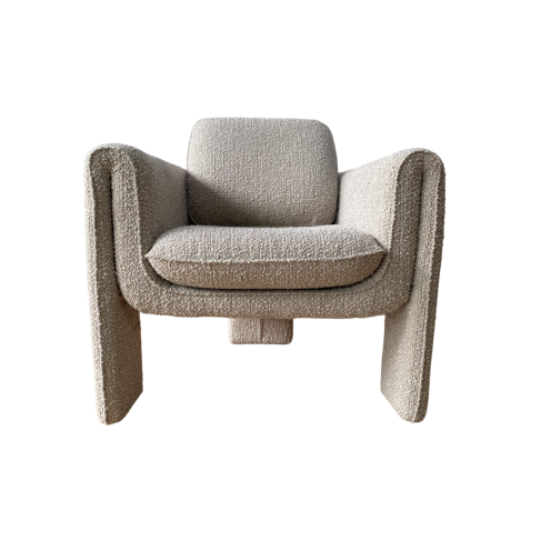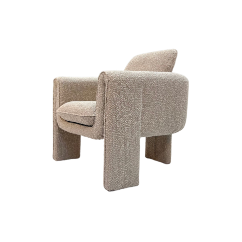 The Monica armchair is a unique combination of curves and angular structures with soft bouclé upholstery in an Art Deco design. This chair offers comfortable support, modern aesthetics and elegance. It features a sturdy wooden frame and cushions for a comfortable sitting experience. Perfect for any room.